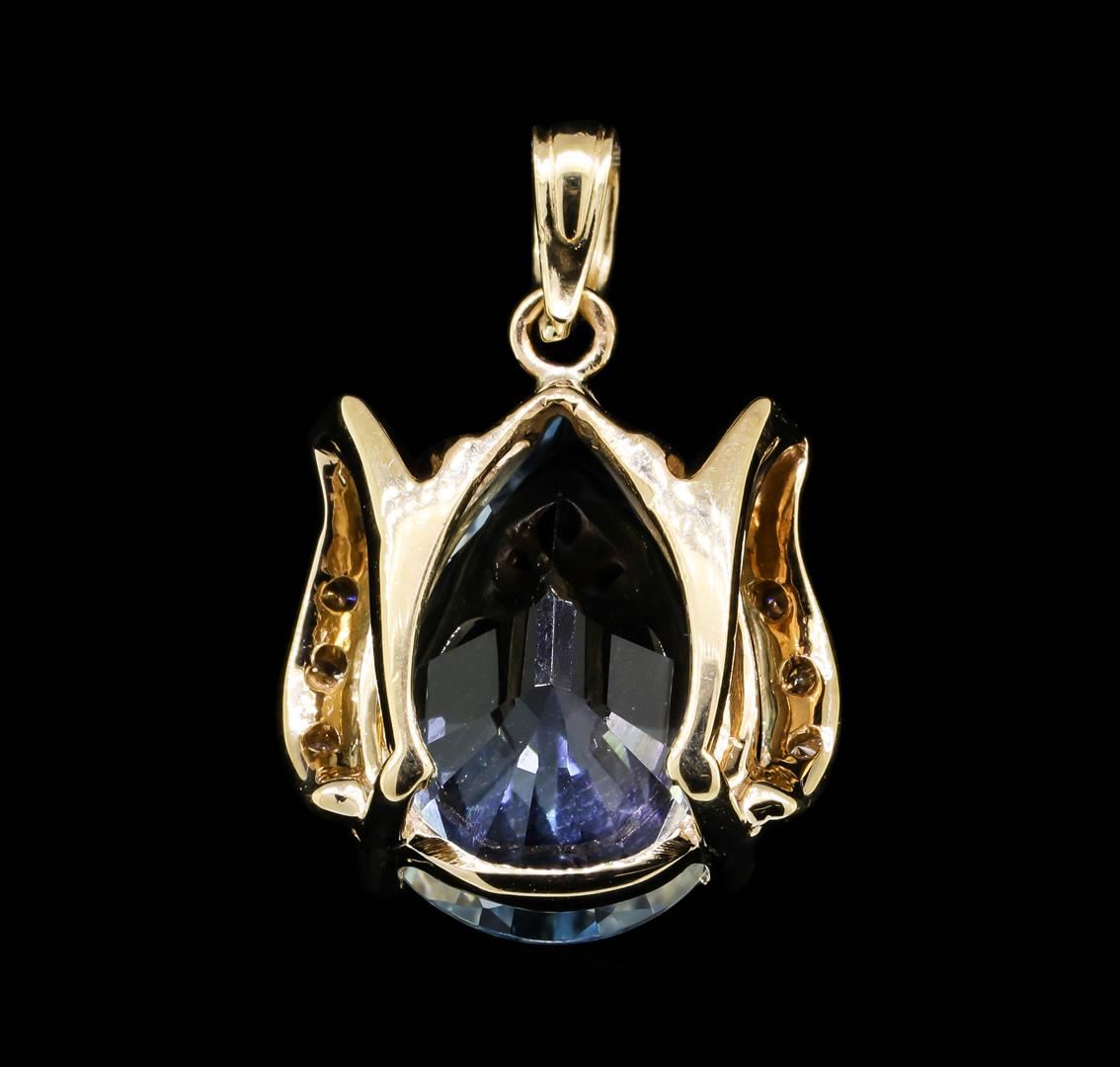 One lady's pendant featuring: 14KT yellow gold weighing 3.2 grams containing one blue topaz weighing 6.40ct and diamonds weighing 0.10ctw
