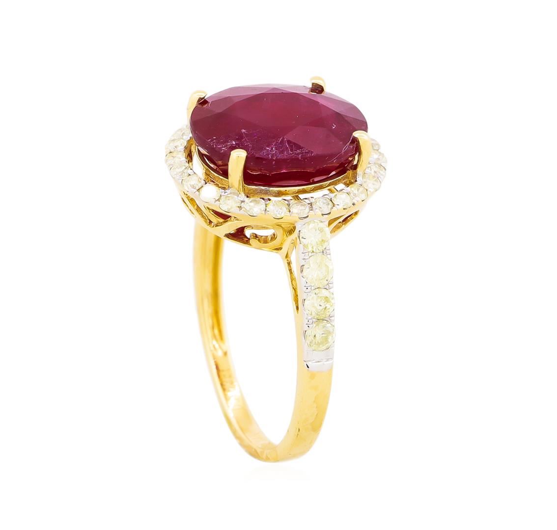 One electronically tested 14KT yellow gold ladies cast ruby and diamond ring. The featured ruby is set within a diamond bezel supported by an elaborate lattice under gallery and diamond ribbon shoulders, completed by a one millimeter wide band. Bright polish finish with rhodium accents. Trademark is Orianne. Identified with markings of "14K". Condition is new, good workmanship. Containing: One prong set oval mixed cut natural ruby approximate weight of 6.47ct., clarity is heavily included, type II, medium dark, very slightly brownish, slightly purplish red color, (GIA slpR 6/3), cut is good. Transmitting light somewhat diffusely, transparent to translucent. Naturally occurring internal & external characteristics are present. Indications of laboratory high temperature heat treatment, with glass & flux additives. Graded in the setting. Ruby has a low tolerance to rhodium plating, repolishing the surface, & ultrasonic cleaning.Thirty-Four prong set round brilliant cut diamonds approximate. Total Weight of 34 Stones = 0.62ct. The group is composed of a mix of natural very light yellow and light yellow color diamonds. Graded in the setting. Clarity: I-1 to I-3. Total Weight of Colored Stones 6.47ct. Total Weight of Diamonds 0.62ct. Total Weight of Ring 3.77gm. AIG Appraised at $2,585.00.