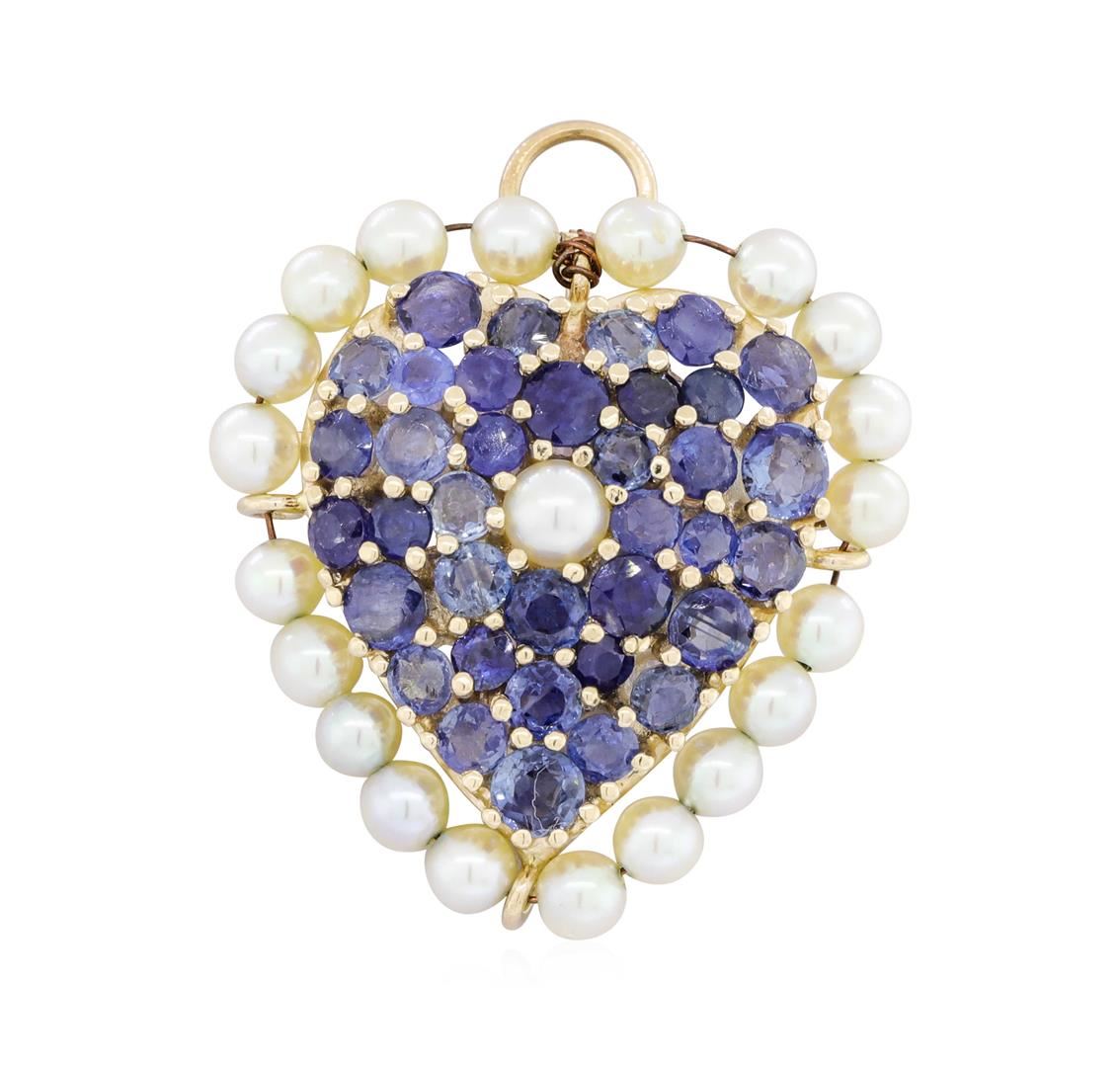 One pin featuring: 14KT yellow gold weighing 11.8 grams containing blue sapphires weighing 6.48ctw and twenty-one cultured pearls.