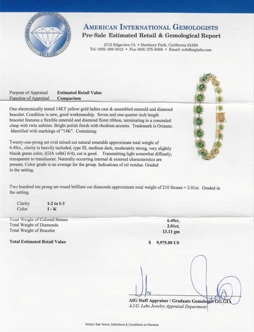 One electronically tested 14KT yellow gold ladies cast & assembled emerald and diamond bracelet. Condition is new, good workmanship. Seven and one-quarter inch length bracelet features a flexible emerald and diamond floret ribbon, terminating in a concealed clasp with twin safeties. Bright polish finish with rhodium accents. Trademark is Orianne. Identified with markings of" 14K". Containing: Twenty-one prong set oval mixed cut natural emeralds approximate total weight of 6.49ct., clarity is heavily included, type Ill, medium dark, moderately strong, very slightly bluish green color, (GIA vslbG 6/4), cut is good. Transmitting light somewhat diffusely, transparent to translucent. Naturally occurring internal & external characteristics are present. Color grade is an average for the group. Indications of oil residue. Graded in the setting. Two hundred ten prong set round brilliant cut diamonds approximate total weight of 210 stones is 2.01cts. Graded in the setting. Clarity (I-2 to I-3) and color of I-K. Total weight of colored stones 6.49cts. Total weight of diamonds is 2.01cts. Total weight of bracelet is 13.11 grams. AIG Appraised at $9,975.00.