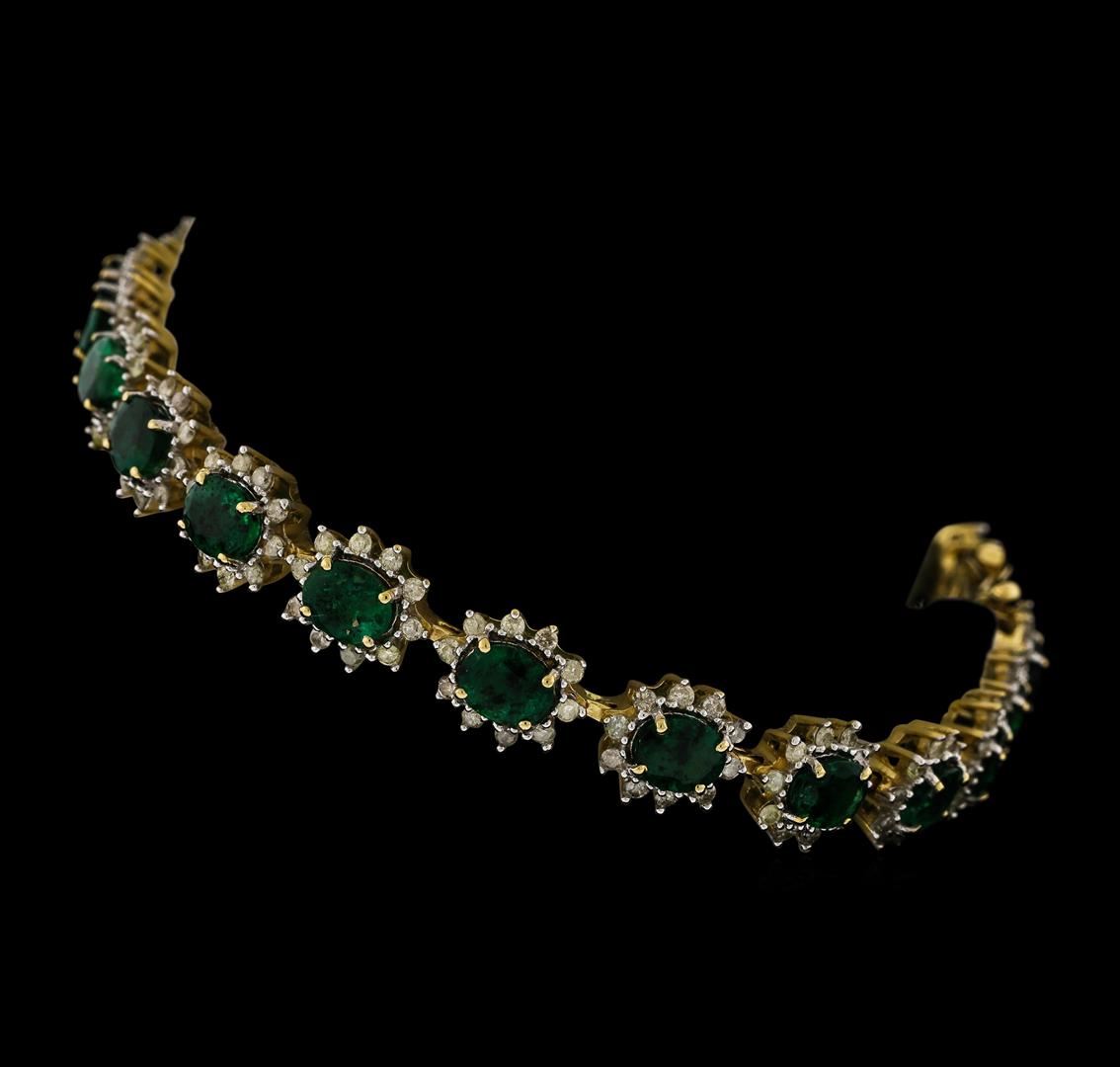One electronically tested 14KT yellow gold ladies cast & assembled emerald and diamond bracelet. Condition is new, good workmanship. Seven and one-quarter inch length bracelet features a flexible emerald and diamond floret ribbon, terminating in a concealed clasp with twin safeties. Bright polish finish with rhodium accents. Trademark is Orianne. Identified with markings of" 14K". Containing: Twenty-one prong set oval mixed cut natural emeralds approximate total weight of 6.49ct., clarity is heavily included, type Ill, medium dark, moderately strong, very slightly bluish green color, (GIA vslbG 6/4), cut is good. Transmitting light somewhat diffusely, transparent to translucent. Naturally occurring internal & external characteristics are present. Color grade is an average for the group. Indications of oil residue. Graded in the setting. Two hundred ten prong set round brilliant cut diamonds approximate total weight of 210 stones is 2.01cts. Graded in the setting. Clarity (I-2 to I-3) and color of I-K. Total weight of colored stones 6.49cts. Total weight of diamonds is 2.01cts. Total weight of bracelet is 13.11 grams. AIG Appraised.