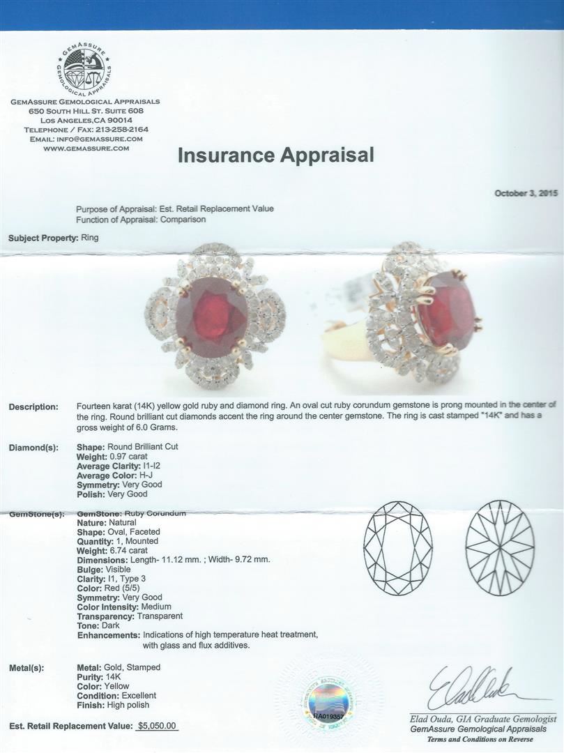 14KT yellow gold ruby and diamond ring. An oval cut ruby corundum gemstone weighing in at an aproximate 6.74 carats is prong mounted in the center of the ring. Approximately 0.97 carats of round brilliant cut diamonds accent the ring around the center gemstones and create a beautiful ornate design. The ring is cast stamped "14K" and has a gross weight of 6.0 grams. Finish: High polish. Condition: Excellent GGA Appraised at $5,050.00.