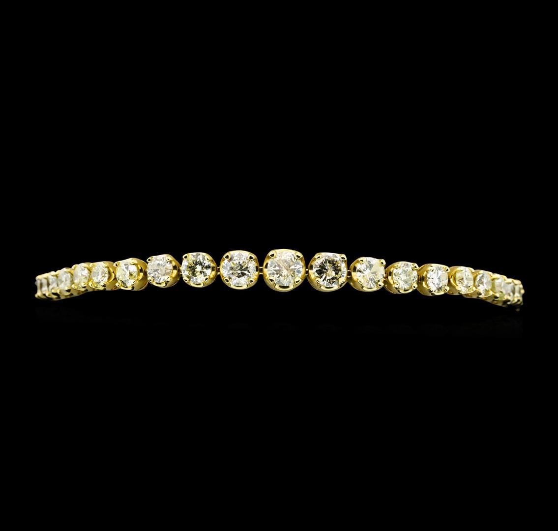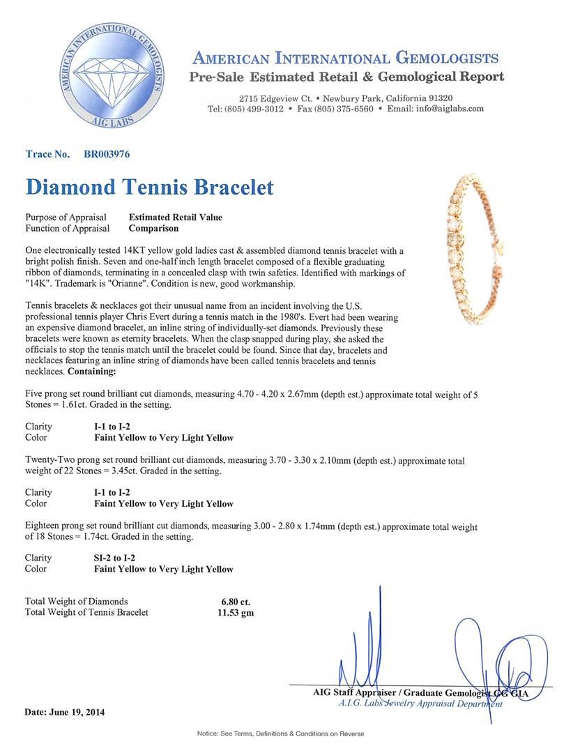 One-half inch length bracelet composed of a flexible graduating ribbon of diamonds, terminating in a concealed clasp with twin safeties. Identified with markings of "14K". Trademark is "Orianne". Condition is new, good workmanship.Tennis bracelets & necklaces got their unusual name from an incident involving the U.S. professional tennis player Chris Evert during a tennis match in the 1980's. Evert had been wearing an expensive diamond bracelet, an inline string of individually-set diamonds. Previously these bracelets were known as eternity bracelets. When the clasp snapped during play, she asked the officials to stop the tennis match until the bracelet could be found. Since that day, bracelets and necklaces featuring an inline string of diamonds have been called tennis bracelets and tennis necklaces. Containing: Five prong set round brilliant cut diamonds, measuring 4.70 - 4.20 x 2.67mm (depth est.) approximate total weight of 5 Stones = 1.61ct. Graded in the setting. Clarity: I-1 to I-2 Twenty-Two prong set round brilliant cut diamonds, measuring 3.70 - 3.30 x 2.10mm (depth est.) approximate total weight of 22 Stones = 3.45ct. Graded in the setting. Clarity: I-1 to I-2 Eighteen prong set round brilliant cut diamonds, measuring 3.00 - 2.80 x 1.74mm (depth est.) approximate total weight of 18 Stones = 1.74ct. Graded in the setting. Clarity: SI-2 to I-2. Total Weight of Diamonds 6.80ct. Total Weight of Tennis Bracelet 11.53gm. AIG Appraised.