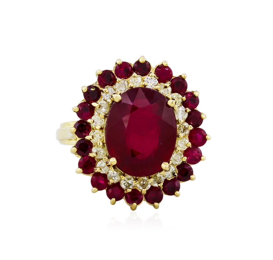 14KT yellow gold ruby and diamond ring. An oval cut natural ruby corundum gemstone weighing in at an aproximate 5.46 carats is prong mounted in the center of the ring. Approximately 0.55 carats of round brilliant cut diamonds and 1.41ctw ruby corundum gemstones accent the ring around the center gemstones. The ring is cast stamped "14K" and has a gross weight of 6.8 grams. The diamonds have an average clarity of I1-I2. Ruby color is red, intensity is medium. Finish: High polish. Condition: Excellent GGA Appraised at $4,750.00.