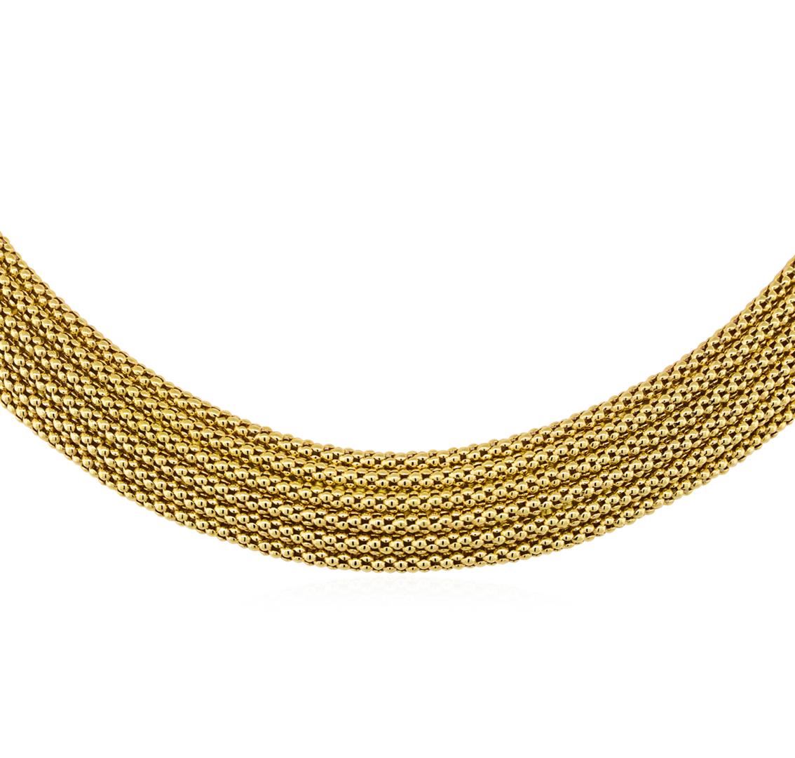 One electronically tested 14KT yellow gold lady's combination cast & assembled fancy necklace with a tongue clasp with fold over safety with a bright polish finish. The featured lady's necklace has a domed six row mesh motif measuring 15.8 millimeters in width and measures 17.5 inches in total length Trademark is Italy. Identified with markings of "14K". Condition is new, good workmanship. Total Weight of Necklace 55.60gm. GAS Appraised at $9,260.00.