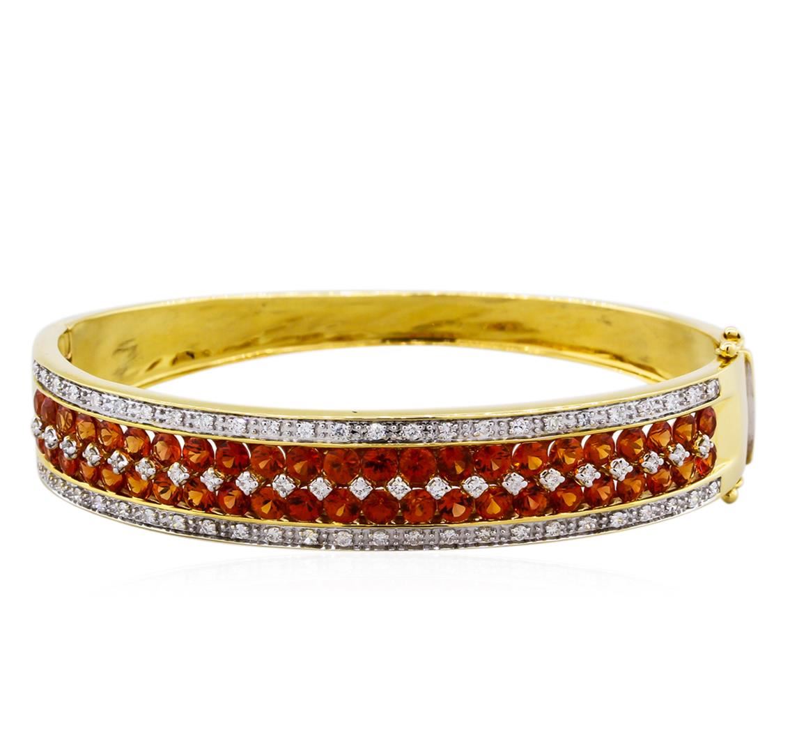 One bangle bracelet featuring: 14KT yellow gold weighing 22.70 grams containing 46 orange sapphires with a total weight of 7.00ct and 72 round diamonds with a total weight of 0.85ct.