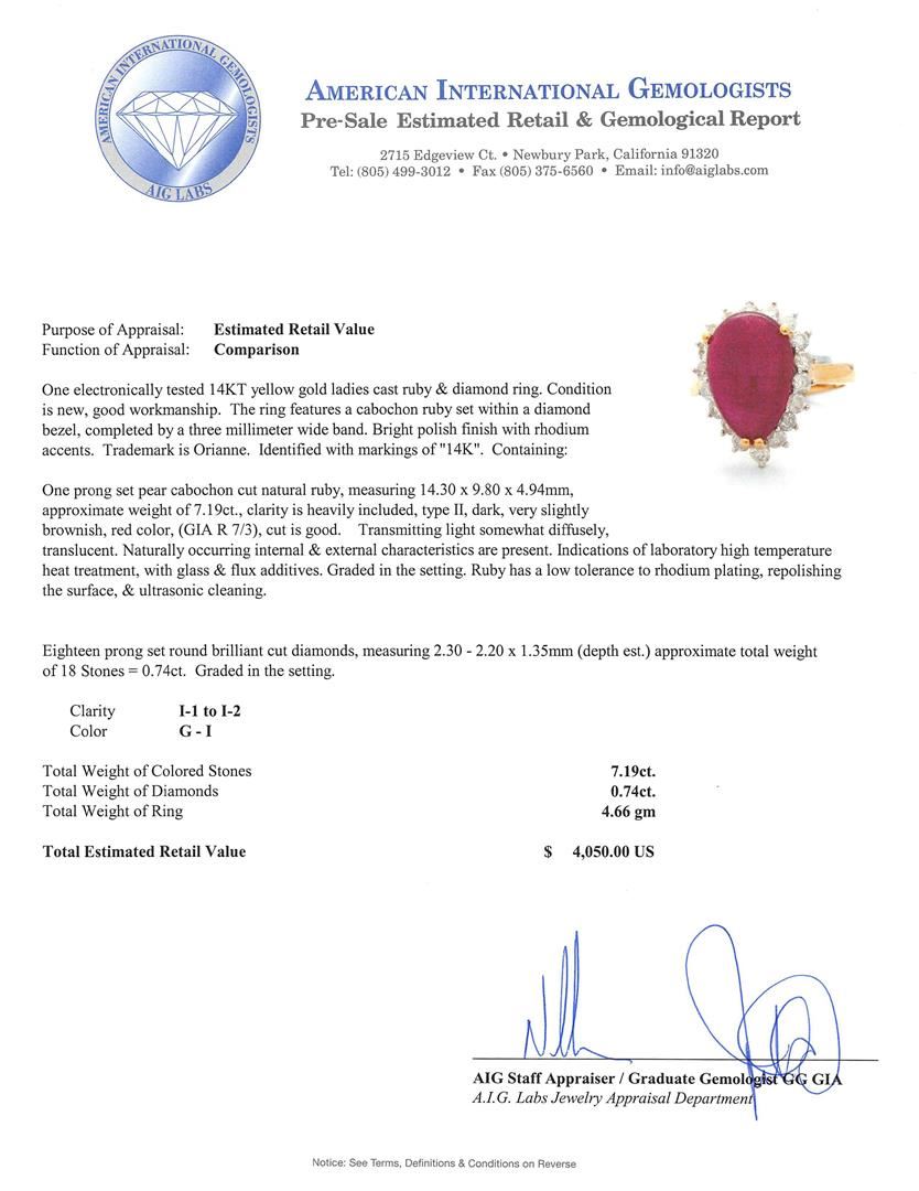 One electronically tested 14KT yellow gold ladies cast ruby & diamond ring. The ring features a cabochon ruby set within a diamond bezel, completed by a three millimeter wide band. Bright polish finish with rhodium accents. Trademark is Orianne. Identified with markings of "14K". Condition is new, good workmanship. Containing: One prong set pear cabochon cut natural ruby, measuring 14.30 x 9.80 x 4.94mm, approximate weight of 7.19ct., clarity is heavily included, type II, dark, very slightly brownish, red color, (GIA R 7/3), cut is good. Transmitting light somewhat diffusely, translucent. Naturally occurring internal & external characteristics are present. Indications of laboratory high temperature heat treatment, with glass & flux additives. Graded in the setting. Ruby has a low tolerance to rhodium plating, repolishing the surface, & ultrasonic cleaning. Eighteen prong set round brilliant cut diamonds, measuring 2.30 - 2.20 x 1.35mm (depth est.) approximate total weight of 18 Stones = 0.74ct. Graded in the setting. Clarity: I-1 to I-2. Color: G - I. Total Weight of Colored Stones 7.19ct. Total Weight of Diamonds 0.74ct. Total Weight of Ring 4.66gm. AIG Appraised at $4,050.00.