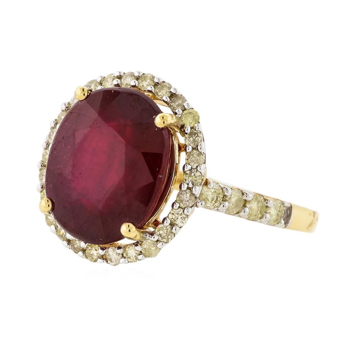 One electronically tested 14KT yellow gold ladies cast ruby and diamond ring. The featured ruby is set within a diamond bezel supported by a lattice under gallery and diamond set shoulders, completed by a one millimeter wide band. Bright polish finish with rhodium accents. Trademark is Orianne. Identified with markings of "14K". Condition is new, good workmanship. Containing: One prong set oval mixed cut natural ruby, measuring 12.10 x 10.00 x 6.40mm, approximate weight of 7.22ct., clarity is heavily included, type II, dark, very slightly brownish, slightly purplish red color, (GIA slpR 7/3), cut is good. Transmitting light somewhat diffusely, transparent to translucent. Naturally occurring internal & external characteristics are present. Indications of laboratory high temperature heat treatment, with glass & flux additives. Graded in the setting. Ruby has a low tolerance to rhodium plating, repolishing the surface, & ultrasonic cleaning. Thirty-Four prong set round brilliant cut diamonds approximate total weight of 34 Stones = 0.58ct. The color grade reflects the range of color for this group. Graded in the setting. Clarity: I-1 to I-3. Color: J - M. Total Weight of Colored Stones 7.22ct. Total Weight of Diamonds 0.58ct. Total Weight of Ring 4.30gm. AIG Appraised at $2,990.00.