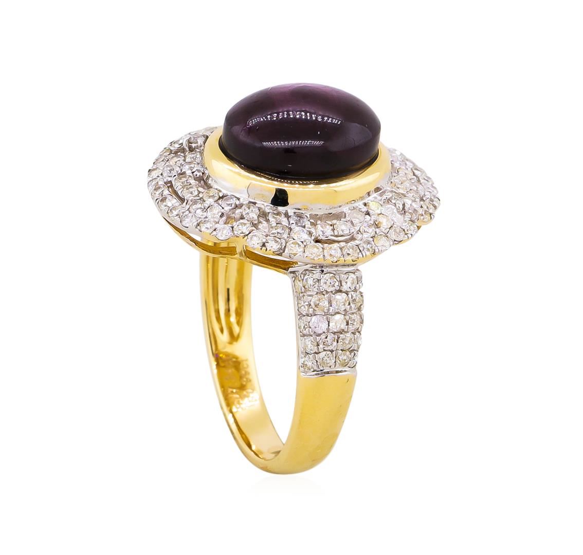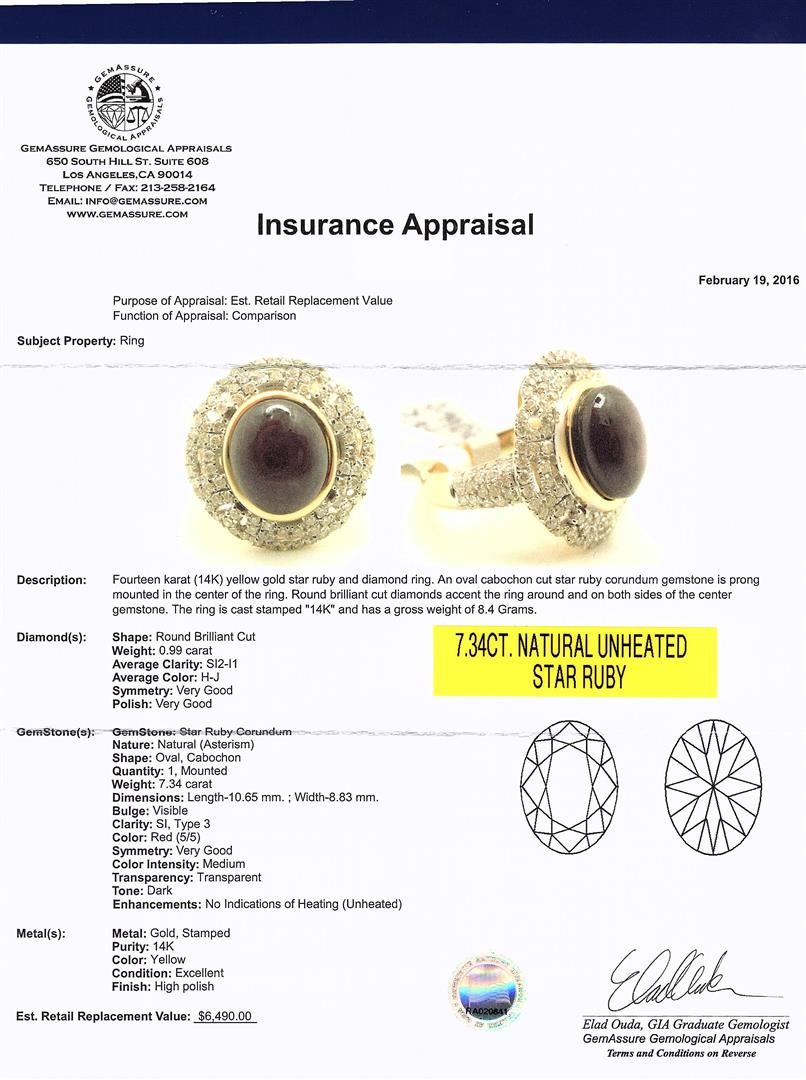 Fourteen Karat (14K) Yellow Gold Star Ruby And Diamond Ring. An Oval Cabochon Cut Star Ruby Corundum Gemstone Is Prong Mounted In The Center The Ring, Round Brilliant Diamonds Accent The Ring Around And On Both Sides Center Gemstone. The Ring Is Cast Stamped "14K' And Has A Weight Of 8.4 Grams. Diamonds: Shape: Brilliant Cut. Weight: O.99 Carat. Average Clarity: Si2-I1. Average Color: H-J. Symmetry: Very Good. Polish: Very Good. Gemstone: 7.34 Carat Natural Unheated Star Ruby. Nature: Natural (Asterism). Shape: Oval Cabochon. Quantity: L, Mounted. Weight: 7.34 Carat. Dimensions: Length-10.65Mm, Width--8.83Mm. Bulge: Visible. Clarity: Si, Type 3. Color: Red (5/5), Symmetry: Very Good. Color Intensity: Medium. Transparency: Transparent. Tone: Dark. Enhancements: No Indications Of Heating (Unheated). Metal: Gold. Stamped. Purity: 14K. Color: Yellow. Condition: Excellent. Finish: High Polish. GGA Appraised at $6,490.00.