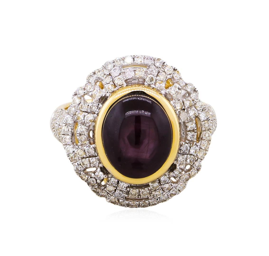 Fourteen Karat (14K) Yellow Gold Star Ruby And Diamond Ring. An Oval Cabochon Cut Star Ruby Corundum Gemstone Is Prong Mounted In The Center The Ring, Round Brilliant Diamonds Accent The Ring Around And On Both Sides Center Gemstone. The Ring Is Cast Stamped "14K' And Has A Weight Of 8.4 Grams. Diamonds: Shape: Brilliant Cut. Weight: O.99 Carat. Average Clarity: Si2-I1. Average Color: H-J. Symmetry: Very Good. Polish: Very Good. Gemstone: 7.34 Carat Natural Unheated Star Ruby. Nature: Natural (Asterism). Shape: Oval Cabochon. Quantity: L, Mounted. Weight: 7.34 Carat. Dimensions: Length-10.65Mm, Width--8.83Mm. Bulge: Visible. Clarity: Si, Type 3. Color: Red (5/5), Symmetry: Very Good. Color Intensity: Medium. Transparency: Transparent. Tone: Dark. Enhancements: No Indications Of Heating (Unheated). Metal: Gold. Stamped. Purity: 14K. Color: Yellow. Condition: Excellent. Finish: High Polish. GGA Appraised at $6,490.00.