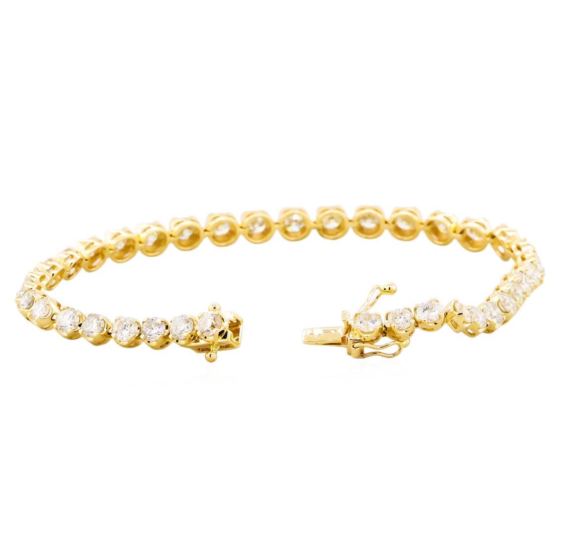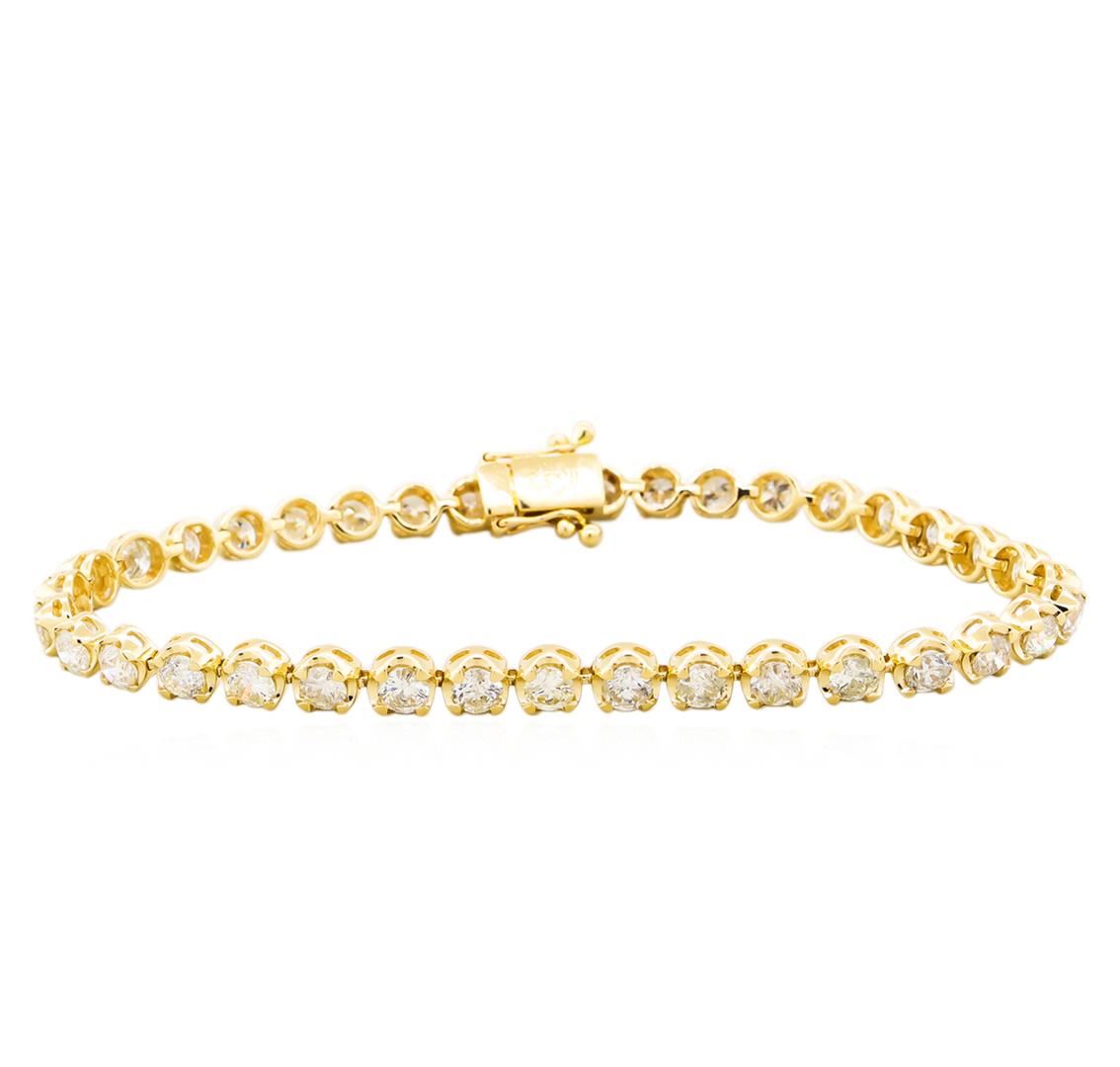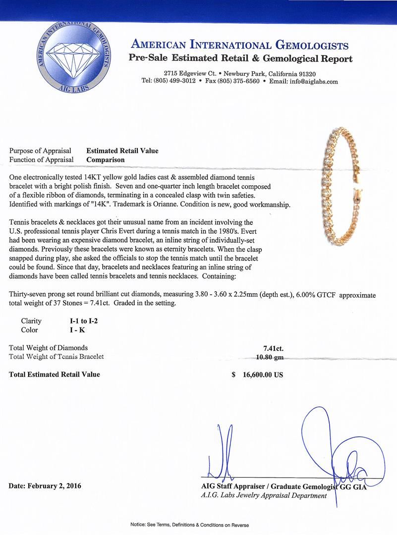 One electronically tested 14KT yellow gold ladies cast & assembled diamond tennis bracelet with a bright polish finish. Seven and one-quarter inch length bracelet composed of a flexible ribbon of diamonds, terminating in a concealed clasp with twin safeties. Identified with markings of "14K". Trademark is Orianne. Condition is new, good workmanship.Tennis bracelets & necklaces got their unusual name from an incident involving the U.S. professional tennis player Chris Evert during a tennis match in the 1980's. Evert had been wearing an expensive diamond bracelet, an inline string of individually-set diamonds. Previously these bracelets were known as eternity bracelets. When the clasp snapped during play, she asked the officials to stop the tennis match until the bracelet could be found. Since that day, bracelets and necklaces featuring an inline string of diamonds have been called tennis bracelets and tennis necklaces. Containing: Thirty-Seven prong set round brilliant cut diamonds, measuring 3.80 - 3.60 x 2.25mm (depth est.), 6.00.%. GTCF approximate. Total Weight of 37 Stones = 7.41ct. Graded in the setting. Clarity: I-1 to I-2. Color: I - K. Total Weight of Diamonds 7.41ct. Total Weight of Tennis Bracelet 10.80gm. AIG Appraised at $16,600.00.