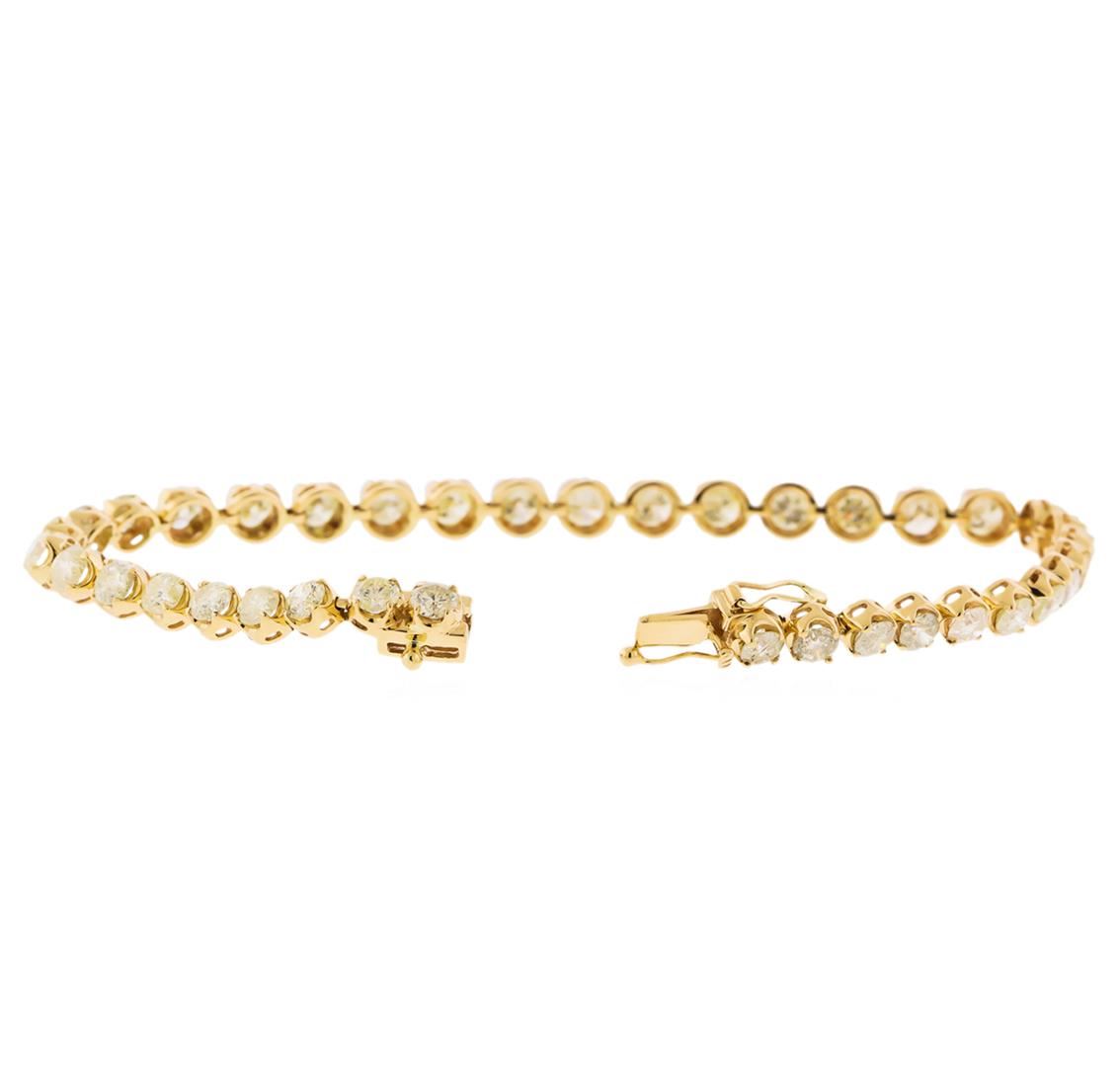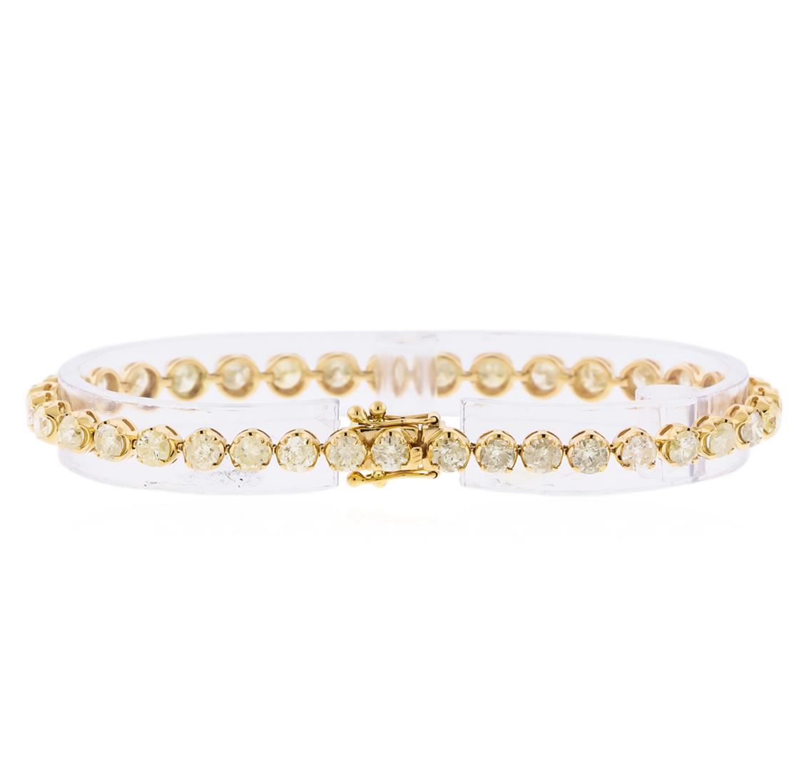 One electronically tested 14KT yellow gold ladies cast & assembled diamond tennis bracelet with a bright polish finish. Seven and one-quarter inch length bracelet composed of a flexible ribbon of diamonds, terminating in a concealed clasp with twin safeties. Identified with markings of "14K". Trademark is Orianne. Condition is new, good workmanship.Tennis bracelets & necklaces got their unusual name from an incident involving the U.S. professional tennis player Chris Evert during a tennis match in the 1980's. Evert had been wearing an expensive diamond bracelet, an inline string of individually-set diamonds. Previously these bracelets were known as eternity bracelets. When the clasp snapped during play, she asked the officials to stop the tennis match until the bracelet could be found. Since that day, bracelets and necklaces featuring an inline string of diamonds have been called tennis bracelets and tennis necklaces. Condition is new, good workmanship. Containing: Thirty-Seven prong set round brilliant cut diamonds, measuring 3.90 - 3.60 x 2.25mm (depth est.) approximate total weight of 37 Stones = 7.43ct. The color grade reflects the entire range of color for this group. Graded in the setting. Clarity: SI-2 to I-2. Color: I - L. Total Weight of Diamonds 7.43ct. Total Weight of Bracelet 10.95gm. AIG Appraised at $20,730.00.