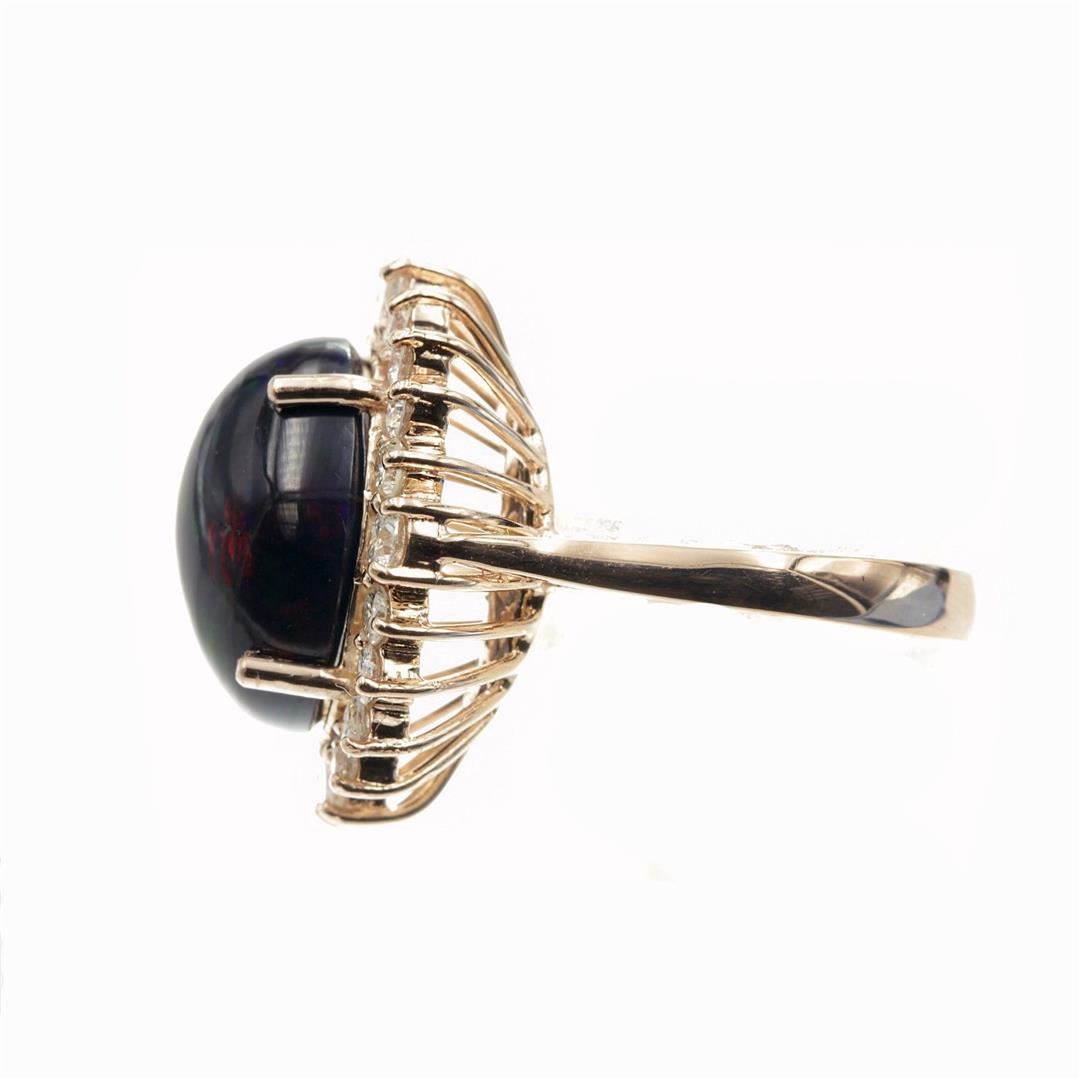 One Natural Diamond and Opal Anniversary Ring in 14k Gold. Size 6.75 but can be resized. Ring design is fancy cocktail with a split shank. Four-prong setting with a total gram weight of 8.20g and total carat weight of 7.46 Ct. Ring includes a total of 20 diamonds. Main stone is natural and non-enhanced. Main stone shape is opal, 6.09 ct,, fine dark clarity, and green opal color. Height of opal is 15.80 mm and width is 12.60 mm, with excellent cut. Side stone is natural and not enhanced, totaling 1.37 Ct. Diamond color is G, clarity VS2-SI1, shape is round cut, and cut is excellent.