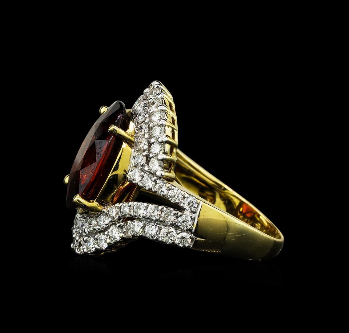 One electronically tested 14KT yellow gold lady's combination cast & assembled fashion ring with a split bypass shank with a bright polish finish. The featured lady's ring has a shank measuring 2.30 millimeters wide. Identified with markings of "14K". Condition is new, good workmanship. Containing: One prong set oval modified mixed cut natural malaya garnet, measuring 12.93 x 11.52 x 5.68mm, (depth est.) 10%. bulge factor, approximate weight of 7.50ct., clarity is eye clean, medium dark, strong, reddish orange color, (GIA rO 6/5), cut is good. Transmitting light with no distortion, transparent. Colored gemstones are presumed to have been subjected to commonly used enhancement processes. Graded in the setting.Thirty prong set round brilliant cut diamonds, measuring 1.90 - 1.80 x 1.15mm (depth est.) approximate total weight of 30 Stones = 0.74ct. Graded in the setting. Clarity: VS-2 to SI-1. Color: G - HCut Good Forty prong set round brilliant cut diamonds, measuring 1.70 - 1.60 x 1.02mm (depth est.) approximate total weight of 40 Stones = 0.68ct. Graded in the setting. Clarity: VS-2 to SI-1. Color: G - HCut Good. Total Weight of Colored Stones 7.50ct. Total Weight of Diamonds 1.42ct. Total Weight of Ring 7.50gm. GAS Appraised.
