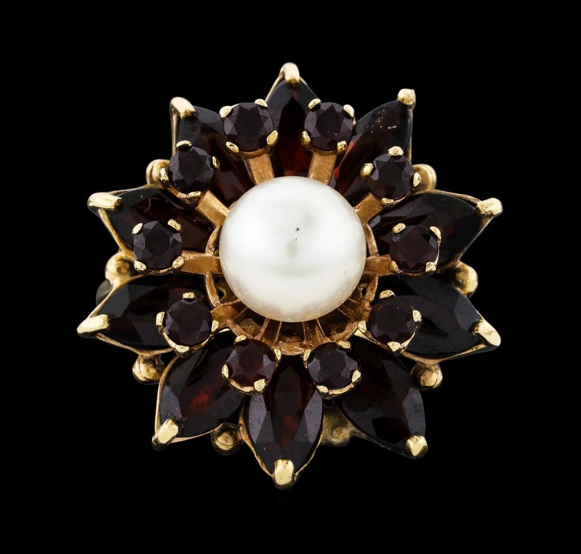 One electronically tested 14KT yellow gold lady's cast fashion ring with a split shank basket halo with a bright polish finish. The featured lady's ring has a shank measuring 2.00 millimeters wide. Trademark is Siffari. Identified with markings of "14K". Condition is new, good workmanship. Containing: One natural cultured pearl, 7.7mm to 7.7mm in size. The pearl is white in color with a good luster, round, and mostly clean. Graded in the setting. Ten prong set marquise modified brilliant cut natural pyrope garnets, measuring 7.50 x 4.00 x 2.60mm, (depth est.) approximate total weight of 5.50ct., clarity is eye clean, dark, very slightly brownish, red color, (GIA R 7/3), cut is good. Transmitting light with no distortion, transparent. Colored gemstones are presumed to have been subjected to commonly used enhancement processes. Graded in the setting. Ten prong set round modified brilliant cut natural pyrope garnets, measuring 2.70 - 2.60 x 1.72 mm, (depth est.) approximate total weight of 0.90ct., clarity is eye clean, dark, moderately strong, red color, (GIA R 7/4), cut is good. Transmitting light with no distortion, transparent. Colored gemstones are presumed to have been subjected to commonly used enhancement processes. Graded in the setting. Total Weight of Colored Stones 6.40ct. Total Weight of Ring 10.40gm. GAS Appraised.
