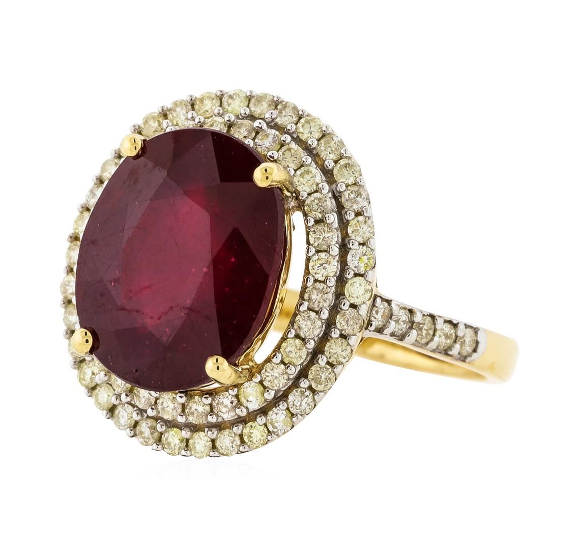 One electronically tested 14KT yellow gold ladies cast ruby and diamond ring. The featured ruby is set within tiered diamond bezels supported by a lattice under gallery and diamond set shoulders, completed by a two millimeter wide band. Bright polish finish with rhodium accents. Trademark is Orianne. Identified with markings of "14K". Condition is new, good workmanship. Containing: One prong set oval mixed cut natural ruby, measuring 12.55 x 10.05 x 6.95mm, 8%. bulge factor, approximate weight of 7.89ct., clarity is heavily included, type II, dark, very slightly brownish, slightly purplish red color, (GIA slpR 7/3), cut is good. Transmitting light somewhat diffusely, transparent to translucent. Naturally occurring internal & external characteristics are present. Indications of laboratory high temperature heat treatment, with glass & flux additives. Graded in the setting. Ruby has a low tolerance to rhodium plating, repolishing the surface, & ultrasonic cleaning. Seventy-Two prong set round brilliant cut diamonds approximate total weight of 72 Stones = 0.66ct. Naturally occurring internal & external characteristics are present, including yellow patches of color. Graded in the setting. Clarity: I-1 to I-3. Color: J - L. Total Weight of Colored Stones 7.89ct. Total Weight of Diamonds 0.66ct. Total Weight of Ring 6.58gm. AIG Appraised at $3,925.00.