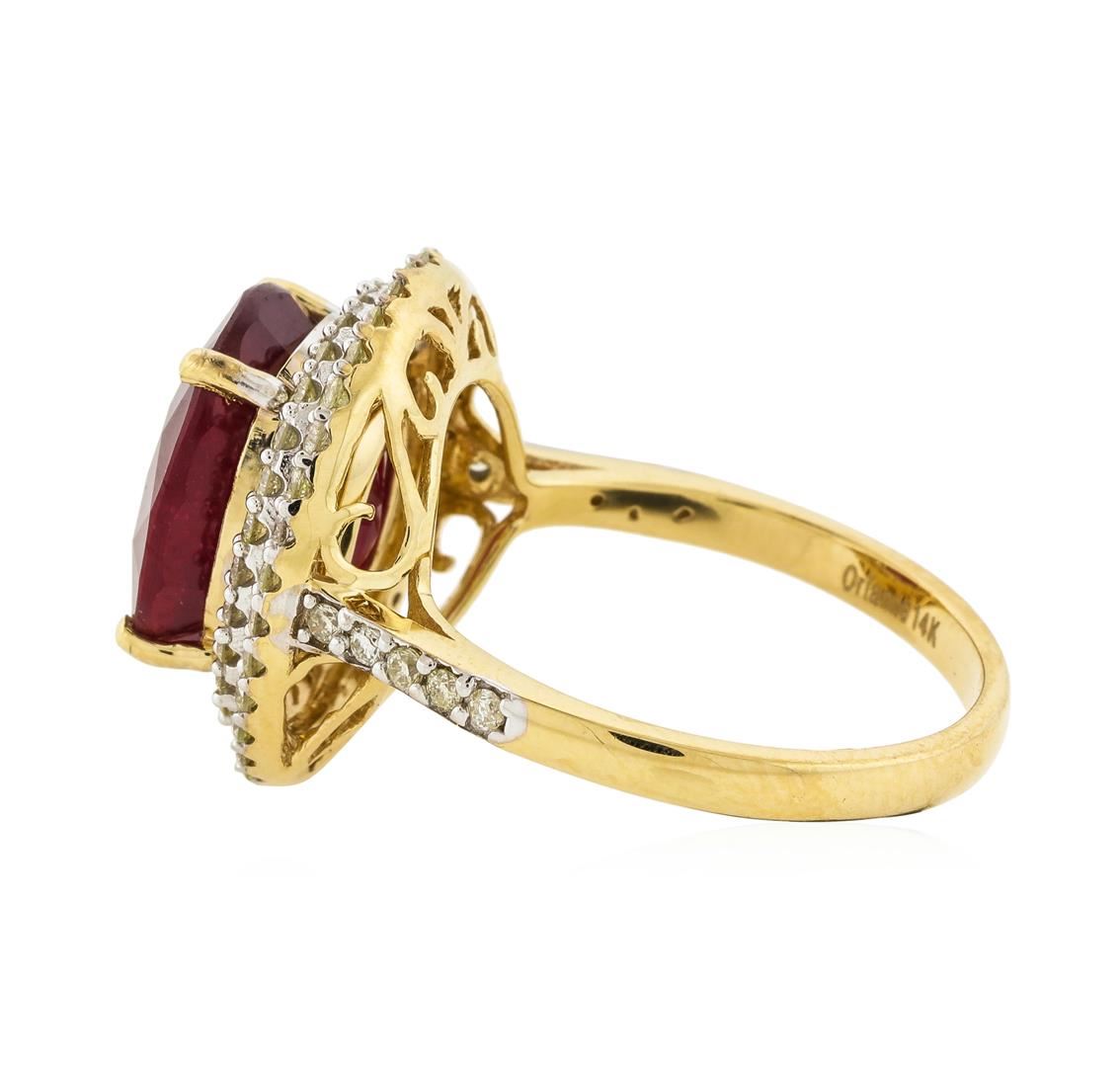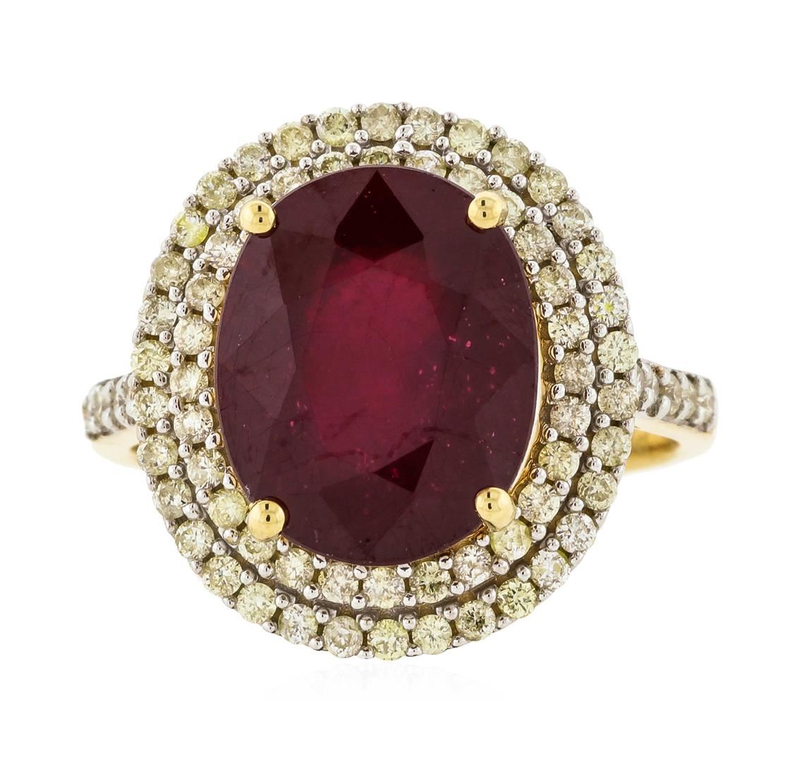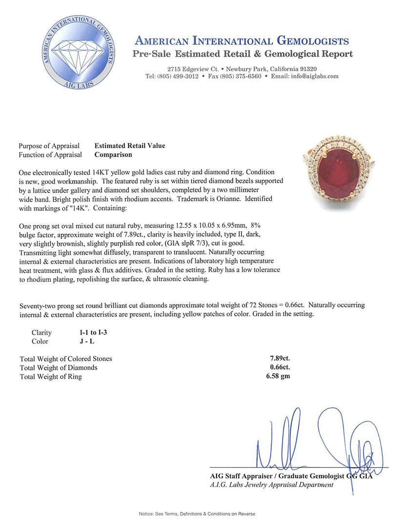 One electronically tested 14KT yellow gold ladies cast ruby and diamond ring. The featured ruby is set within tiered diamond bezels supported by a lattice under gallery and diamond set shoulders, completed by a two millimeter wide band. Bright polish finish with rhodium accents. Trademark is Orianne. Identified with markings of "14K". Condition is new, good workmanship. Containing: One prong set oval mixed cut natural ruby, measuring 12.55 x 10.05 x 6.95mm, 8%. bulge factor, approximate weight of 7.89ct., clarity is heavily included, type II, dark, very slightly brownish, slightly purplish red color, (GIA slpR 7/3), cut is good. Transmitting light somewhat diffusely, transparent to translucent. Naturally occurring internal & external characteristics are present. Indications of laboratory high temperature heat treatment, with glass & flux additives. Graded in the setting. Ruby has a low tolerance to rhodium plating, repolishing the surface, & ultrasonic cleaning. Seventy-Two prong set round brilliant cut diamonds approximate total weight of 72 Stones = 0.66ct. Naturally occurring internal & external characteristics are present, including yellow patches of color. Graded in the setting. Clarity: I-1 to I-3. Color: J - L. Total Weight of Colored Stones 7.89ct. Total Weight of Diamonds 0.66ct. Total Weight of Ring 6.58gm. AIG Appraised.