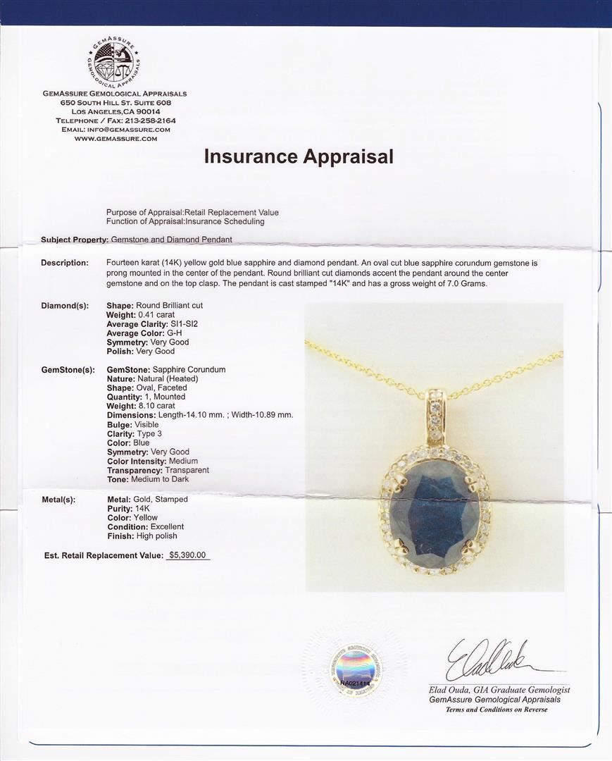 Fourteen karat (14K) yellow gold blue sapphire and diamond pendant. An oval cut blue sapphire corundum gemstone, weighing approximately 8.10 cts, is prong mounted in the center of the pendant. Round brilliant cut diamonds, weighing approximately 0.41ctw with an average clarity of SI1-SI2 and an average color of G-H, accent the pendant around the center gemstone and on the top clasp. The pendant is cast stamped "14K" and has a gross weight of 7.0 Grams. GGA Appraised at $5,390.00.