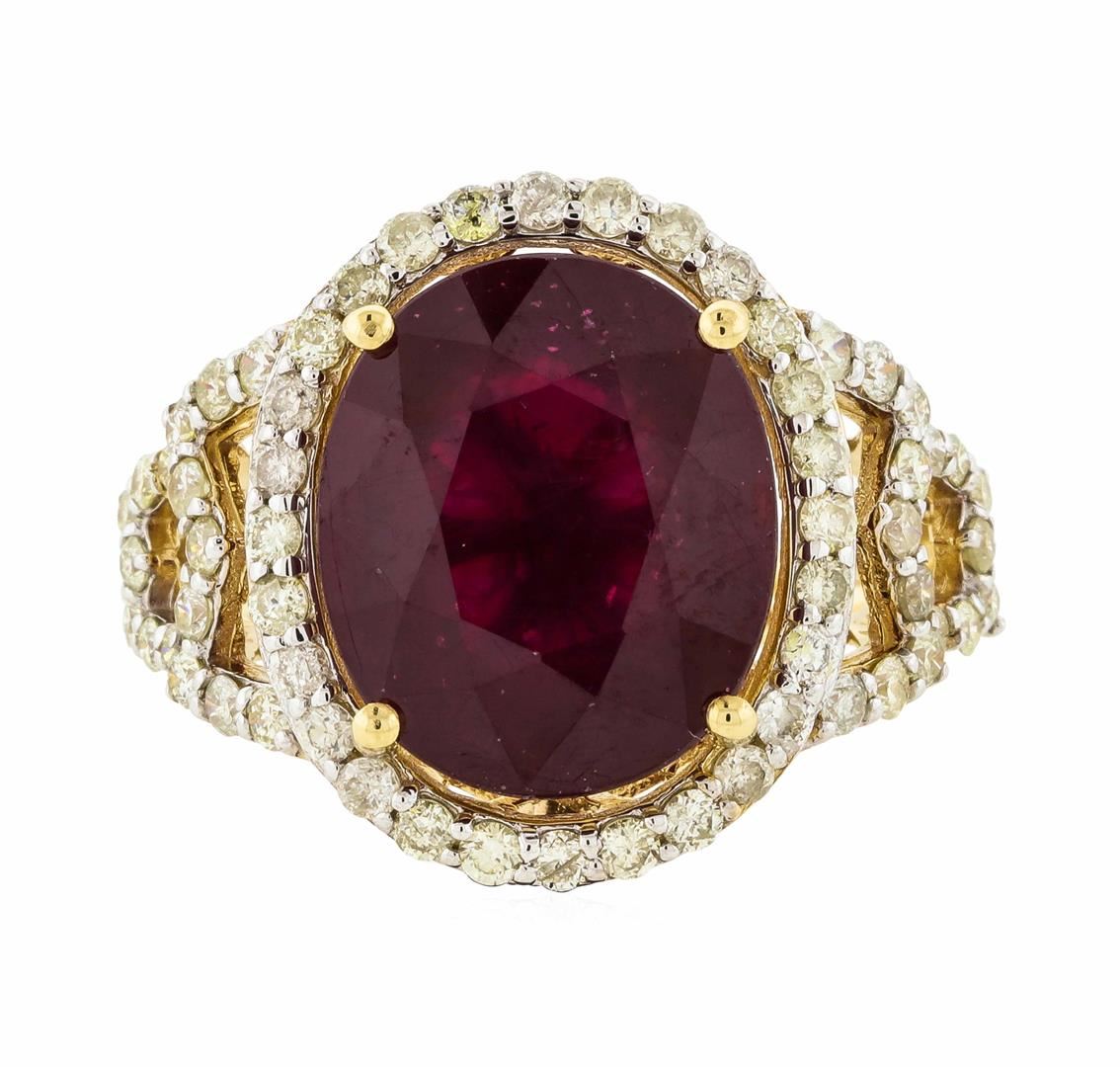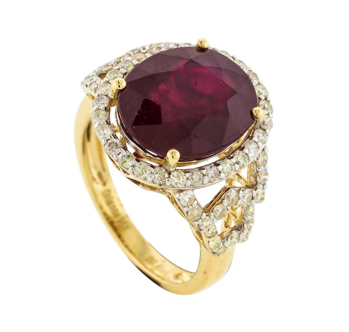 One electronically tested 14KT yellow gold ladies cast ruby and diamond ring. The featured ruby is set within a diamond bezel supported by a lattice under gallery and stylized diamond set shoulders, completed by a two and one-half millimeter wide band. Bright polish finish with rhodium accents. Trademark is Orianne. Identified with markings of "14K". Condition is new, good workmanship. Containing: One prong set oval mixed cut natural ruby, measuring 13.10 x 11.10 x 6.00mm, 10%. bulge factor, approximate weight of 8.23ct., clarity is heavily included, type II, dark, very slightly brownish, slightly purplish red color, (GIA slpR 7/3), cut is good. Transmitting light somewhat diffusely, transparent to translucent. Naturally occurring internal & external characteristics are present. Indications of laboratory high temperature heat treatment, with glass & flux additives. Graded in the setting. Ruby has a low tolerance to rhodium plating, repolishing the surface, & ultrasonic cleaning. Sixty prong set round brilliant cut diamonds approximate total weight of 60 Stones = 0.85ct. The color grade reflects the entire range of color for this group. Graded in the setting. Clarity: I-1 to I-3. Color: H - K. Total Weight of Colored Stones 8.23ct. Total Weight of Diamonds 0.85ct. Total Weight of Ring 5.87gm. AIG Appraised.