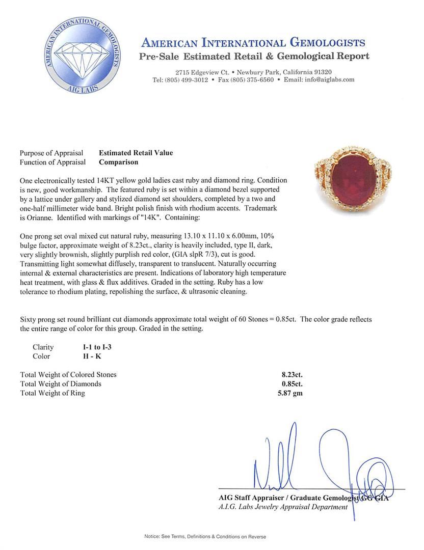 One electronically tested 14KT yellow gold ladies cast ruby and diamond ring. The featured ruby is set within a diamond bezel supported by a lattice under gallery and stylized diamond set shoulders, completed by a two and one-half millimeter wide band. Bright polish finish with rhodium accents. Trademark is Orianne. Identified with markings of "14K". Condition is new, good workmanship. Containing: One prong set oval mixed cut natural ruby, measuring 13.10 x 11.10 x 6.00mm, 10%. bulge factor, approximate weight of 8.23ct., clarity is heavily included, type II, dark, very slightly brownish, slightly purplish red color, (GIA slpR 7/3), cut is good. Transmitting light somewhat diffusely, transparent to translucent. Naturally occurring internal & external characteristics are present. Indications of laboratory high temperature heat treatment, with glass & flux additives. Graded in the setting. Ruby has a low tolerance to rhodium plating, repolishing the surface, & ultrasonic cleaning. Sixty prong set round brilliant cut diamonds approximate total weight of 60 Stones = 0.85ct. The color grade reflects the entire range of color for this group. Graded in the setting. Clarity: I-1 to I-3. Color: H - K. Total Weight of Colored Stones 8.23ct. Total Weight of Diamonds 0.85ct. Total Weight of Ring 5.87gm. AIG Appraised.