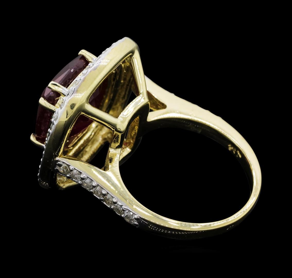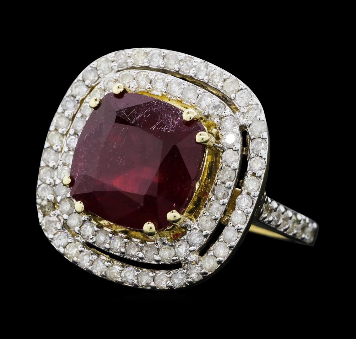 One electronically tested 14KT yellow gold ladies cast & assembled ruby and diamond ring. The featured ruby is set within tiered diamond bezels supported by diamond set shoulders, completed by a one and one-half millimeter wide band. Bright polish finish with rhodium accents. Identified with markings of "K14". Condition is new, good workmanship. Containing: One prong set square cushion mixed cut natural ruby, measuring 11.20 x 11.00 x 6.80mm, approximate weight of 8.27ct., clarity is heavily included, type II, medium dark, very slightly brownish, slightly purplish red color, (GIA slpR 6/3), cut is good. Transmitting light somewhat diffusely, transparent to translucent. Naturally occurring internal & external characteristics are present. Indications of laboratory high temperature heat treatment, with glass & flux additives. Graded in the setting. Ruby has a low tolerance to rhodium plating, repolishing the surface, & ultrasonic cleaning. Eighty-Six prong set round brilliant cut diamonds approximate total weight of 86 Stones = 1.21ct. Graded in the setting. Clarity: I-1 to I-3. Color: G - I. Total Weight of Colored Stones 8.27ct. Total Weight of Diamonds 1.21ct. Total Weight of Ring 11.00gm. AIG Appraised.