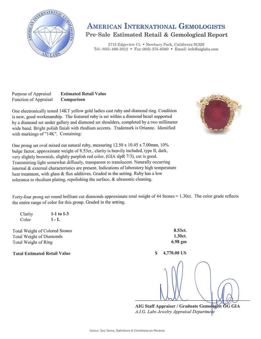 One electronically tested 14KT yellow gold ladies cast ruby and diamond ring. The featured ruby is set within a diamond bezel supported by a diamond set under gallery and diamond set shoulders, completed by a two millimeter wide band. Bright polish finish with rhodium accents. Trademark is Orianne. Identified with markings of "14K". Condition is new, good workmanship. Containing: One prong set oval mixed cut natural ruby, measuring 12.50 x 10.45 x 7.00mm, 10%. bulge factor, approximate weight of 8.53ct., clarity is heavily included, type II, dark, very slightly brownish, slightly purplish red color, (GIA slpR 7/3), cut is good. Transmitting light somewhat diffusely, transparent to translucent. Naturally occurring internal & external characteristics are present. Indications of laboratory high temperature heat treatment, with glass & flux additives. Graded in the setting. Ruby has a low tolerance to rhodium plating, repolishing the surface, & ultrasonic cleaning. Forty-Four prong set round brilliant cut diamonds approximate total weight of 44 Stones = 1.30ct. The color grade reflects the entire range of color for this group. Graded in the setting. Clarity: I-1 to I-3. Color: I - L. Total Weight of Colored Stones 8.53ct. Total Weight of Diamonds 1.30ct. Total Weight of Ring 6.98gm. AIG Appraised at $4,770.00.