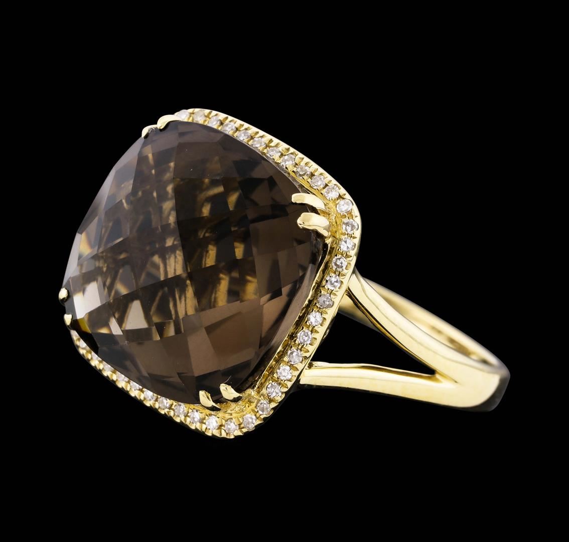One electronically tested 14KT yellow gold lady's cast fashion ring with a split shank cushion halo with a bright polish finish. The featured lady's ring has a shank measuring 2.08 millimeters wide. Identified with markings of "14K". Condition is new, good workmanship. Containing: One prong set square cushion modified mixed cut natural smoky quartz, measuring 13.25 x 13.22 x 7.31mm, (depth est.) 10%. bulge factor, approximate weight of 8.62ct., clarity is eye clean, medium, moderately strong, brown color, (GIA Br 5/4), cut is very good. The featured smoky quartz is cut into a square cushion shape with a checkerboard top. Transmitting light with no distortion, transparent. Colored gemstones are presumed to have been subjected to commonly used enhancement processes. Graded in the setting. Forty-Eight prong set single cut diamonds, measuring 0.90 - 0.85 x 0.55mm (depth est.) approximate total weight of 48 Stones = 0.12ct. Graded in the setting. Clarity: SI-2 to I-1. Color: H - ICut Good. Total Weight of Colored Stones 8.62ct. Total Weight of Diamonds 0.12ct. Total Weight of Ring 5.30gm. GAS Appraised at $1,810.00.