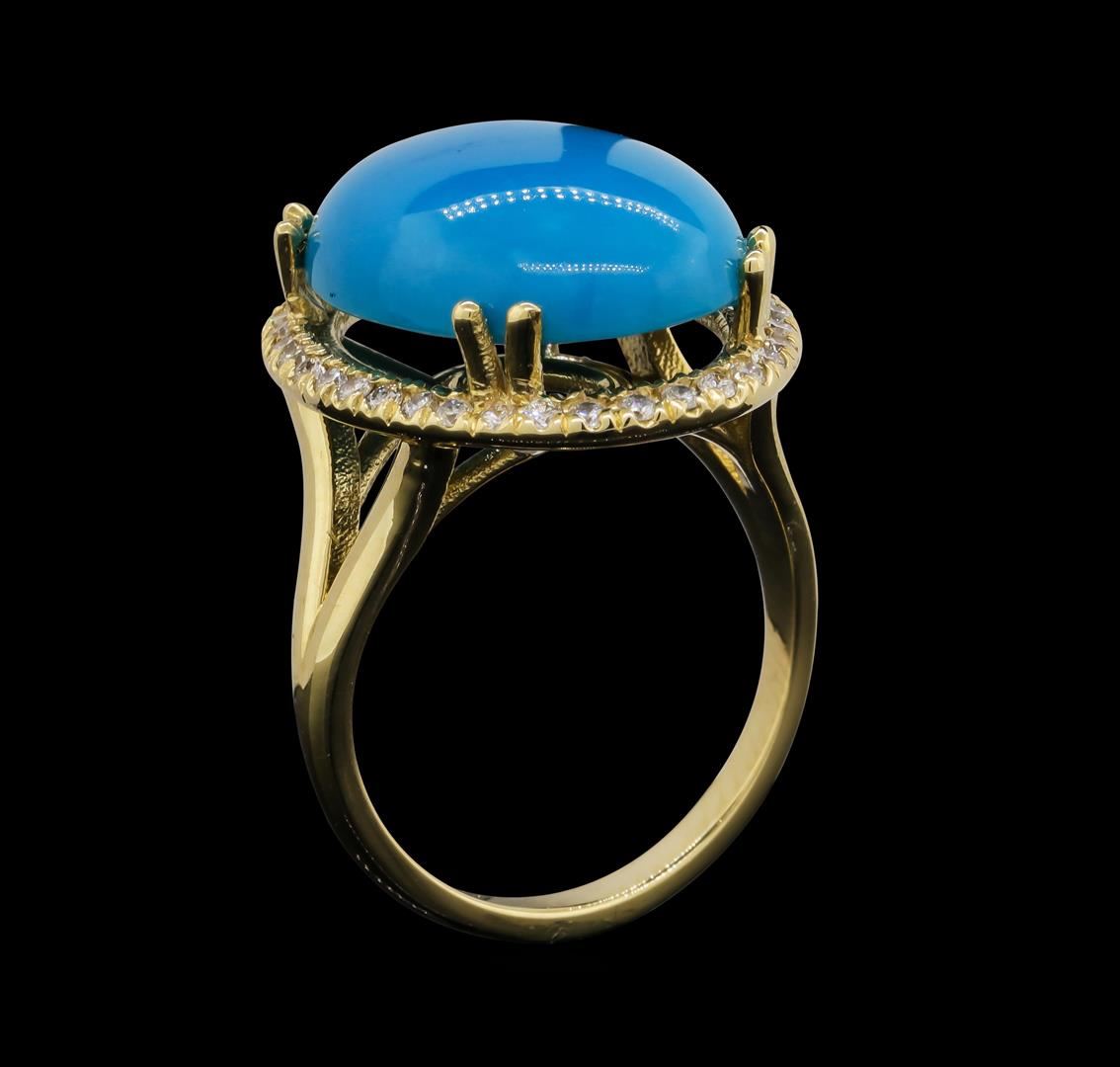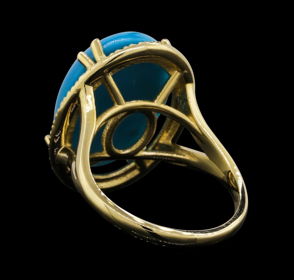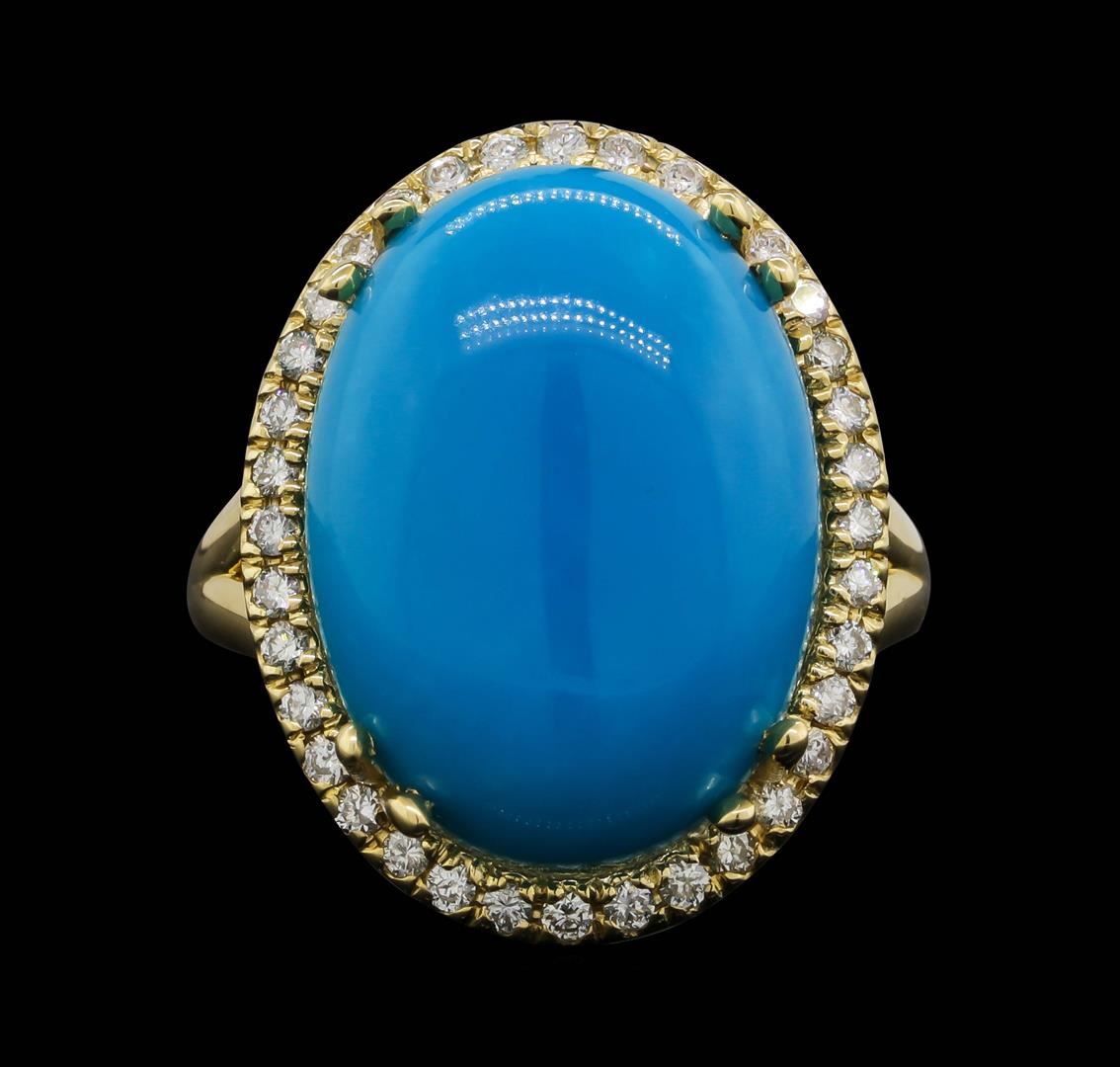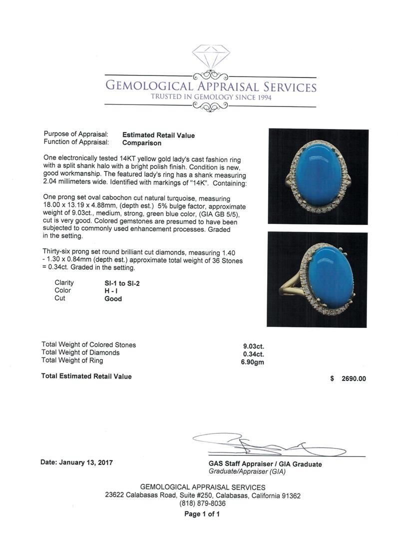 One electronically tested 14KT yellow gold lady's cast fashion ring with a split shank halo with a bright polish finish. The featured lady's ring has a shank measuring 2.04 millimeters wide. Identified with markings of "14K". Condition is new, good workmanship. Containing: One prong set oval cabochon cut natural turquoise, measuring 18.00 x 13.19 x 4.88mm, (depth est.) 5%. bulge factor, approximate weight of 9.03ct., medium, strong, green blue color, (GIA GB 5/5), cut is very good. Colored gemstones are presumed to have been subjected to commonly used enhancement processes. Graded in the setting. Thirty-Six prong set round brilliant cut diamonds, measuring 1.40 - 1.30 x 0.84mm (depth est.) approximate total weight of 36 Stones = 0.34ct. Graded in the setting. Clarity: SI-1 to SI-2. Color: H - ICut Good. Total Weight of Colored Stones 9.03ct. Total Weight of Diamonds 0.34ct. Total Weight of Ring 6.90gm. GAS Appraised at $2,690.00.