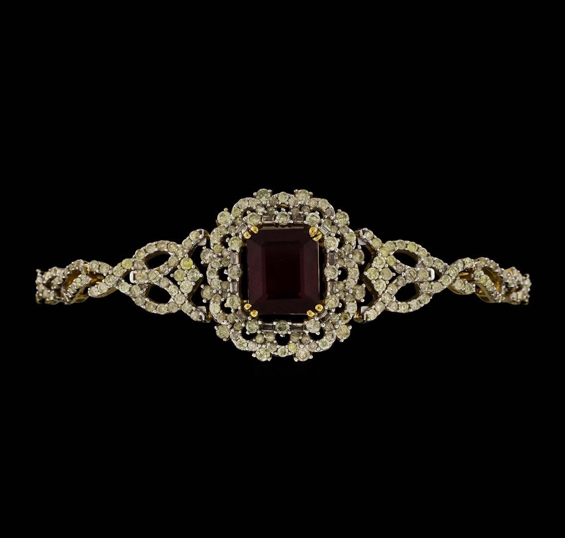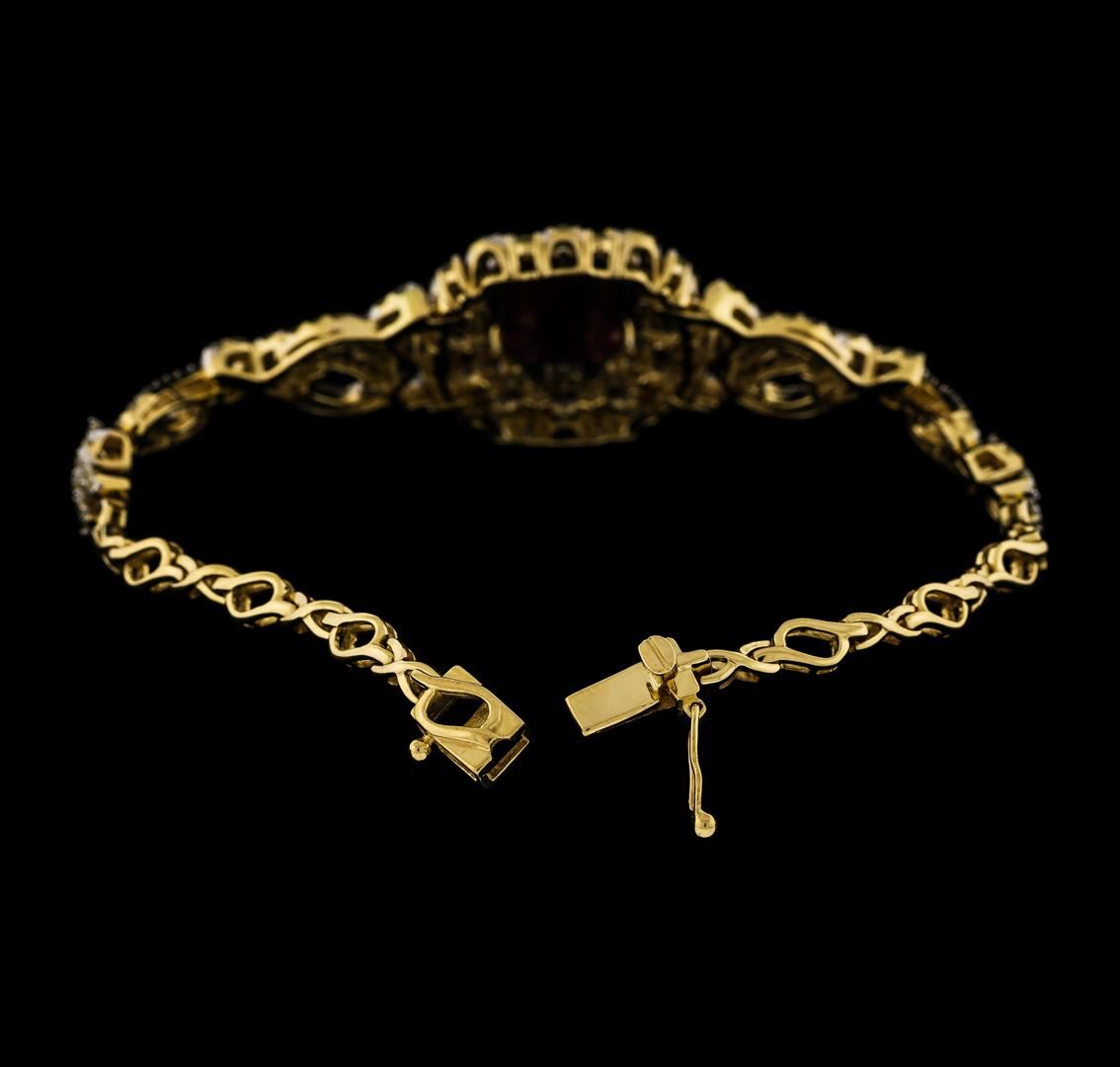 One electronically tested 14KT yellow gold ladies cast & assembled ruby and diamond bracelet. Seven and three-quarter inch length bracelet features a center consisting of a ruby set within a stylized diamond floret bezel supported by flexible floral diamond set ribbon transitioning into matching yellow gold links, terminating in a concealed clasp with safety. Bright polish finish with rhodium accents. Trademark is Orianne. Identified with markings of "925". Condition is new, good workmanship. Containing: One prong set rectangular step cut natural ruby approximate weight of 9.14ct., clarity is heavily included, type II, dark, slightly brownish, slightly purplish red color, (GIA slpR 7/2), cut is good. Transmitting light somewhat diffusely, transparent to translucent. Naturally occurring internal & external characteristics are present. Indications of laboratory high temperature heat treatment, with glass & flux additives. Graded in the setting. Rubyhas a low tolerance to rhodium plating, repolishing the surface, & ultrasonic cleaning. Two Hundred Fourteen prong set round brilliant & baguette cut diamonds approximate total weight of 214 Stones = 3.64ct. The clarity grade reflects the entire range of clarity for this group. Graded in the setting. Clarity: SI-2 to I-3. Color: I - K. Total Weight of Colored Stones 9.14ct. Total Weight of Diamonds 3.64ct. Total Weight of Bracelet 19.52gm. AIG Appraised at $11,950.00.