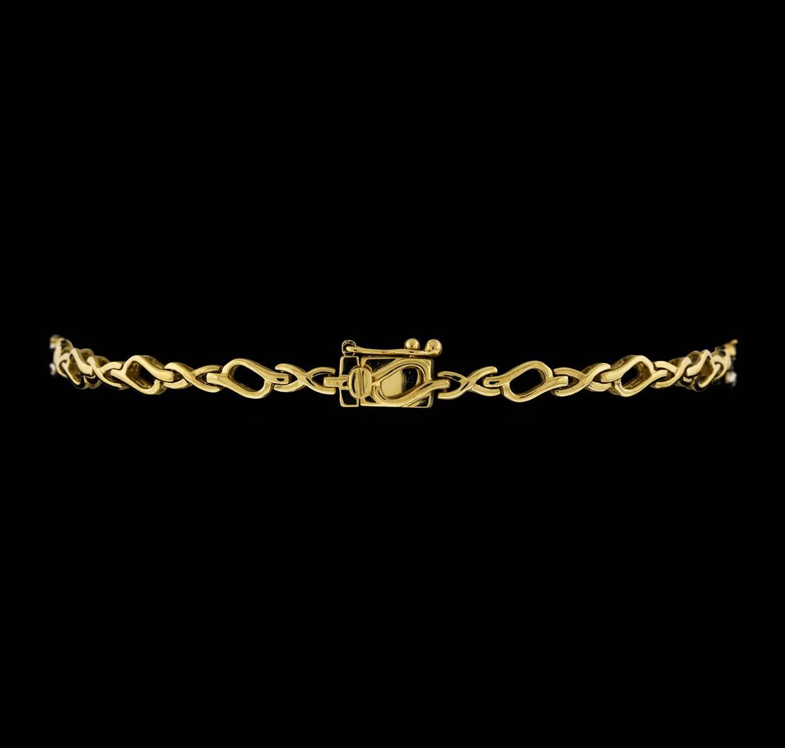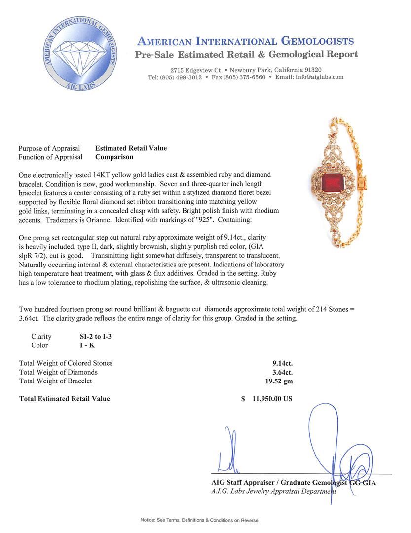 One electronically tested 14KT yellow gold ladies cast & assembled ruby and diamond bracelet. Seven and three-quarter inch length bracelet features a center consisting of a ruby set within a stylized diamond floret bezel supported by flexible floral diamond set ribbon transitioning into matching yellow gold links, terminating in a concealed clasp with safety. Bright polish finish with rhodium accents. Trademark is Orianne. Identified with markings of "925". Condition is new, good workmanship. Containing: One prong set rectangular step cut natural ruby approximate weight of 9.14ct., clarity is heavily included, type II, dark, slightly brownish, slightly purplish red color, (GIA slpR 7/2), cut is good. Transmitting light somewhat diffusely, transparent to translucent. Naturally occurring internal & external characteristics are present. Indications of laboratory high temperature heat treatment, with glass & flux additives. Graded in the setting. Rubyhas a low tolerance to rhodium plating, repolishing the surface, & ultrasonic cleaning. Two Hundred Fourteen prong set round brilliant & baguette cut diamonds approximate total weight of 214 Stones = 3.64ct. The clarity grade reflects the entire range of clarity for this group. Graded in the setting. Clarity: SI-2 to I-3. Color: I - K. Total Weight of Colored Stones 9.14ct. Total Weight of Diamonds 3.64ct. Total Weight of Bracelet 19.52gm. AIG Appraised at $11,950.00.