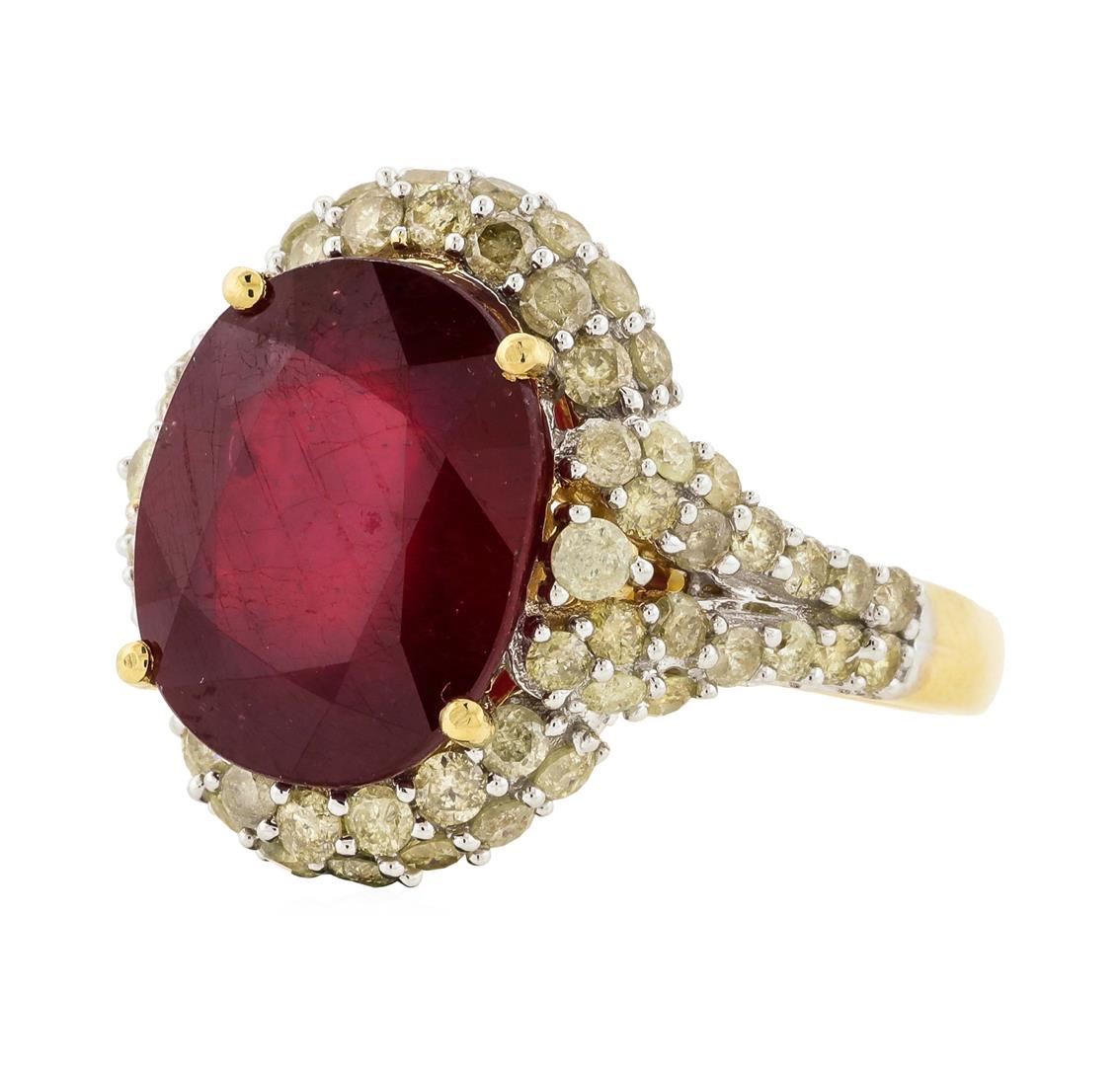 One electronically tested 14KT yellow gold ladies cast ruby and diamond ring. The featured ruby is set within a stylized diamond bezel supported by a lattice under gallery and diamond set split shoulders, completed by a two and one-half millimeter wide band. Bright polish finish with rhodium accents. Trademark is Orianne. Identified with markings of "14K". Condition is new, good workmanship. Containing: One prong set oval mixed cut natural ruby, measuring 13.25 x 10.50 x 6.85mm, 15%. bulge factor, approximate weight of 9.30ct., clarity is heavily included, type II, medium dark, very slightly brownish, slightly purplish red color, (GIA slpR 6/3), cut is good. Transmitting light somewhat diffusely, transparent to translucent. Naturally occurring internal & external characteristics are present. Indications of laboratory high temperature heat treatment, with glass & flux additives. Graded in the setting. Ruby has a low tolerance to rhodium plating, repolishing the surface, & ultrasonic cleaning. Sixty-Eight prong set round brilliant cut diamonds approximate total weight of 68 Stones = 1.56ct. The group is composed of a mix of natural very light brownish yellow, very light yellow, light brownish yellow and light yellow color diamonds. Graded in the setting. Clarity: I-1 to I-3. Total Weight of Colored Stones 9.30ct. Total Weight of Diamonds 1.56ct. Total Weight of Ring 7.36gm. AIG Appraised at $5,000.00.