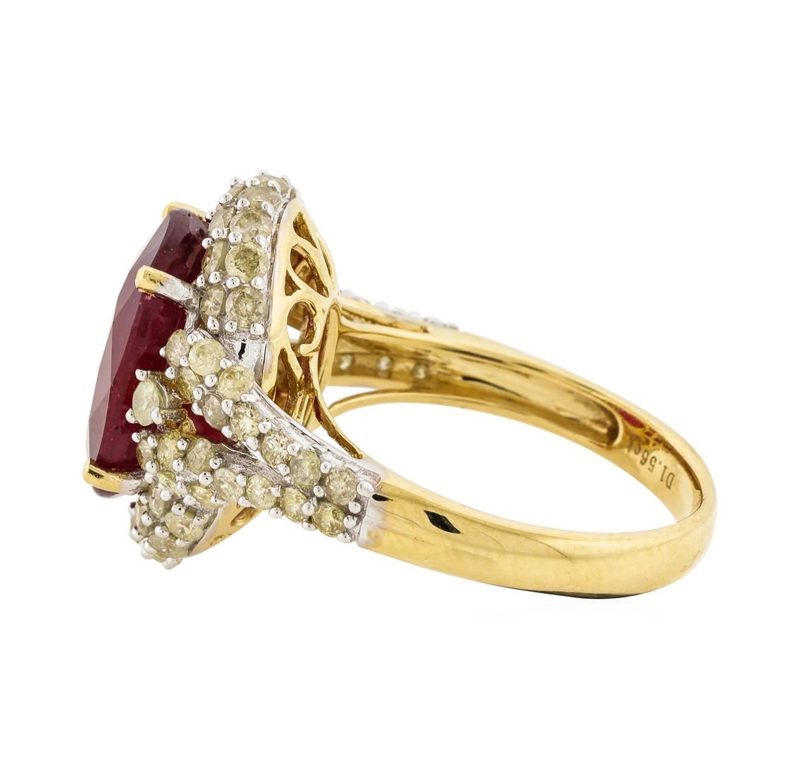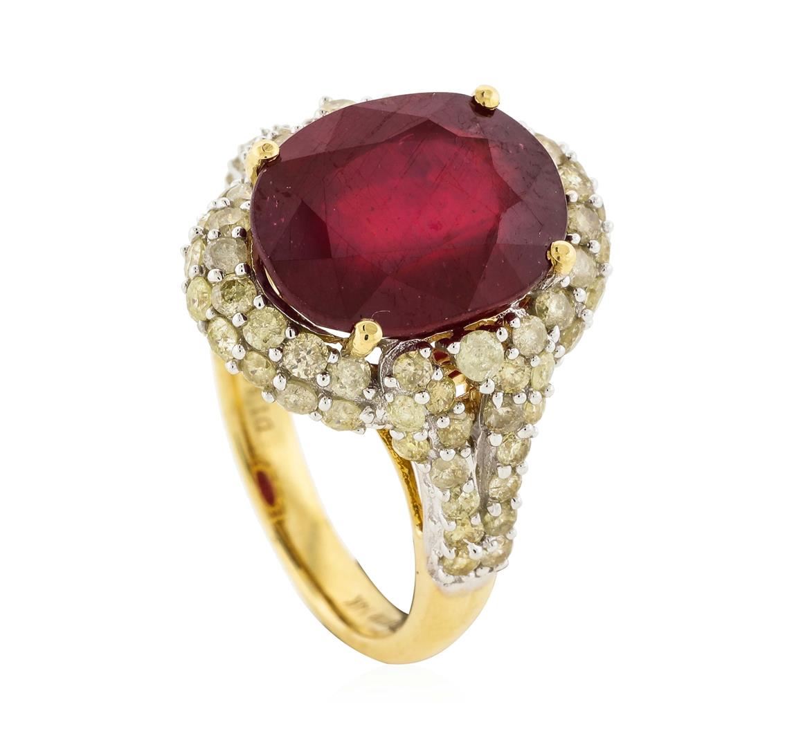 One electronically tested 14KT yellow gold ladies cast ruby and diamond ring. The featured ruby is set within a stylized diamond bezel supported by a lattice under gallery and diamond set split shoulders, completed by a two and one-half millimeter wide band. Bright polish finish with rhodium accents. Trademark is Orianne. Identified with markings of "14K". Condition is new, good workmanship. Containing: One prong set oval mixed cut natural ruby, measuring 13.25 x 10.50 x 6.85mm, 15%. bulge factor, approximate weight of 9.30ct., clarity is heavily included, type II, medium dark, very slightly brownish, slightly purplish red color, (GIA slpR 6/3), cut is good. Transmitting light somewhat diffusely, transparent to translucent. Naturally occurring internal & external characteristics are present. Indications of laboratory high temperature heat treatment, with glass & flux additives. Graded in the setting. Ruby has a low tolerance to rhodium plating, repolishing the surface, & ultrasonic cleaning. Sixty-Eight prong set round brilliant cut diamonds approximate total weight of 68 Stones = 1.56ct. The group is composed of a mix of natural very light brownish yellow, very light yellow, light brownish yellow and light yellow color diamonds. Graded in the setting. Clarity: I-1 to I-3. Total Weight of Colored Stones 9.30ct. Total Weight of Diamonds 1.56ct. Total Weight of Ring 7.36gm. AIG Appraised.