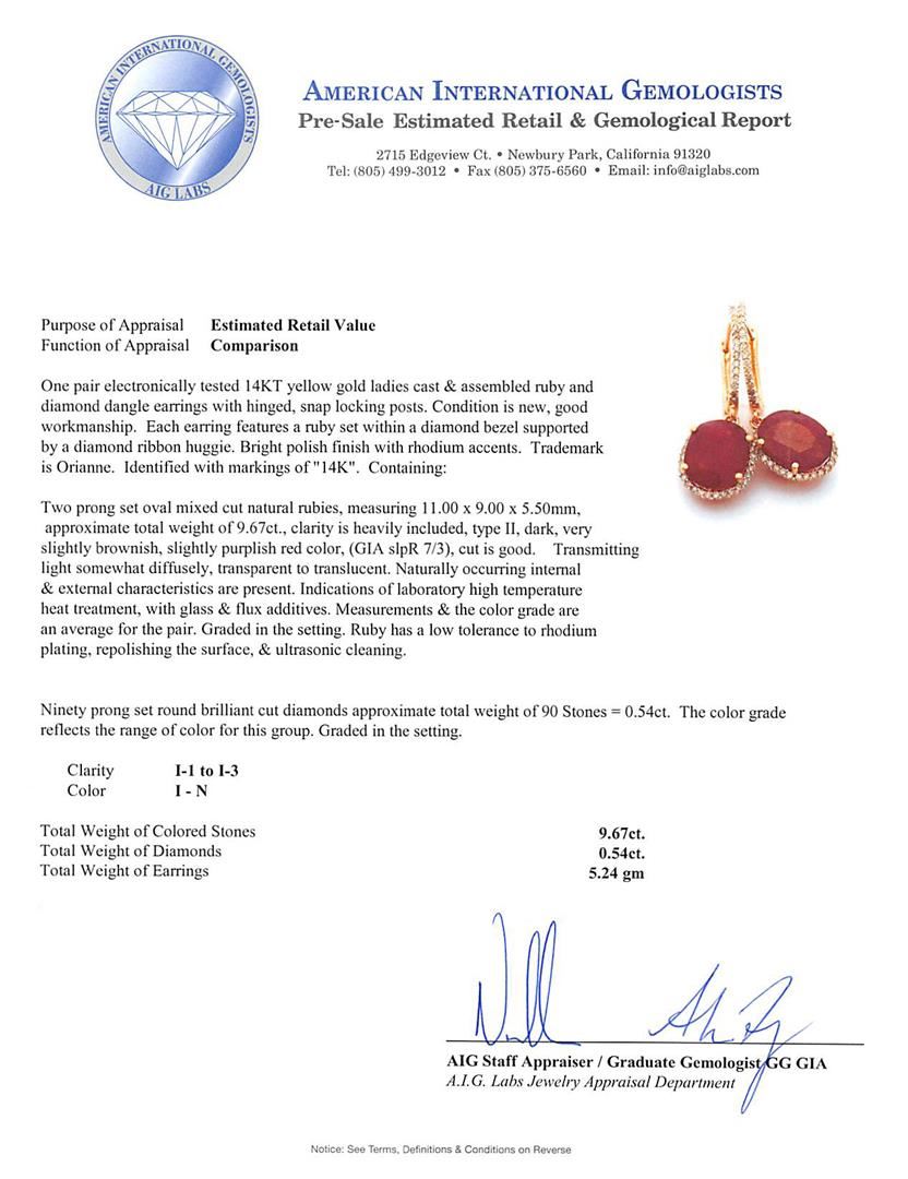 One pair electronically tested 14KT yellow gold ladies cast & assembled ruby and diamond dangle earrings with hinged, snap locking posts. Each earring features a ruby set within a diamond bezel supported by a diamond ribbon huggie. Bright polish finish with rhodium accents. Trademark is Orianne. Identified with markings of "14K". Condition is new, good workmanship. Containing: Two prong set oval mixed cut natural rubies, measuring 11.00 x 9.00 x 5.50mm, approximate total weight of 9.67ct., clarity is heavily included, type II, dark, very slightly brownish, slightly purplish red color, (GIA slpR 7/3), cut is good. Transmitting light somewhat diffusely, transparent to translucent. Naturally occurring internal & external characteristics are present. Indications of laboratory high temperature heat treatment, with glass & flux additives. Measurements & the color grade are an average for the pair. Graded in the setting. Ruby has a low tolerance to rhodium plating, repolishing the surface, & ultrasonic cleaning. Ninety prong set round brilliant cut diamonds approximate total weight of 90 Stones = 0.54ct. The color grade reflects the range of color for this group. Graded in the setting. Clarity: I-1 to I-3. Color: I - N. Total Weight of Colored Stones 9.67ct. Total Weight of Diamonds 0.54ct. Total Weight of Earrings 5.24gm. AIG Appraised.