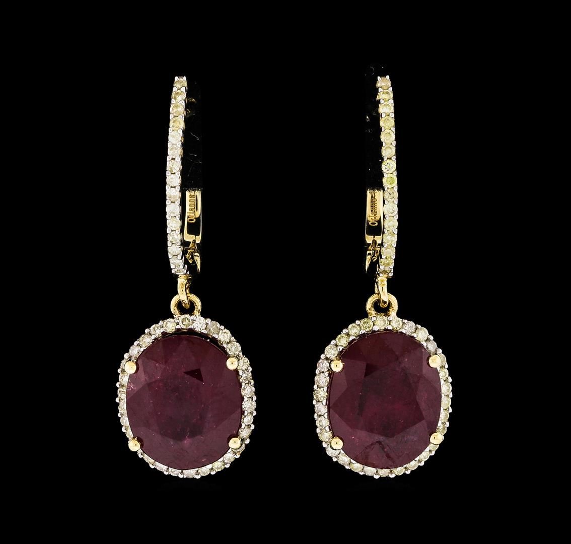 One pair electronically tested 14KT yellow gold ladies cast & assembled ruby and diamond dangle earrings with hinged, snap locking posts. Each earring features a ruby set within a diamond bezel supported by a diamond ribbon huggie. Bright polish finish with rhodium accents. Trademark is Orianne. Identified with markings of "14K". Condition is new, good workmanship. Containing: Two prong set oval mixed cut natural rubies, measuring 11.00 x 9.00 x 5.50mm, approximate total weight of 9.67ct., clarity is heavily included, type II, dark, very slightly brownish, slightly purplish red color, (GIA slpR 7/3), cut is good. Transmitting light somewhat diffusely, transparent to translucent. Naturally occurring internal & external characteristics are present. Indications of laboratory high temperature heat treatment, with glass & flux additives. Measurements & the color grade are an average for the pair. Graded in the setting. Ruby has a low tolerance to rhodium plating, repolishing the surface, & ultrasonic cleaning. Ninety prong set round brilliant cut diamonds approximate total weight of 90 Stones = 0.54ct. The color grade reflects the range of color for this group. Graded in the setting. Clarity: I-1 to I-3. Color: I - N. Total Weight of Colored Stones 9.67ct. Total Weight of Diamonds 0.54ct. Total Weight of Earrings 5.24gm. AIG Appraised.