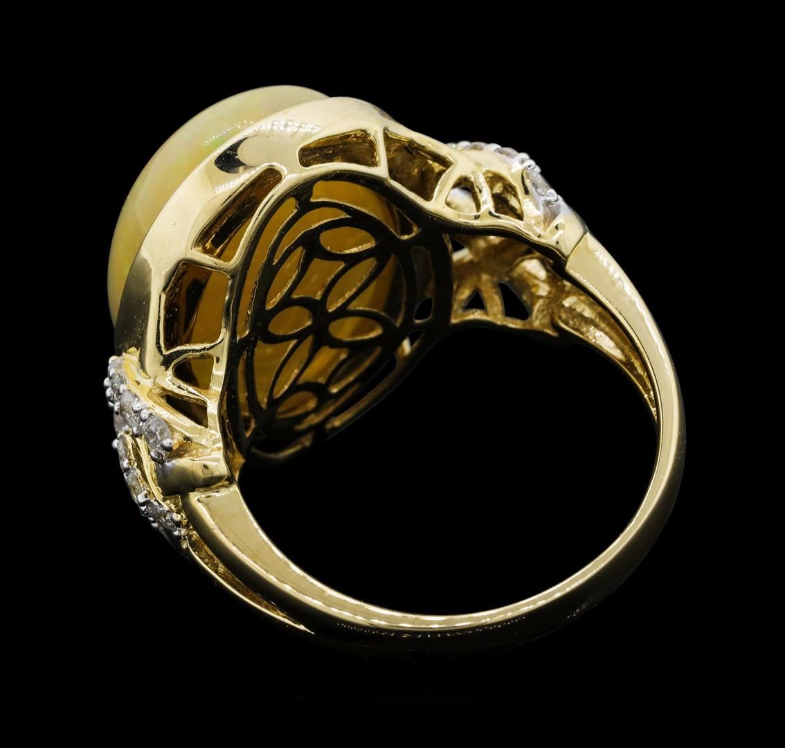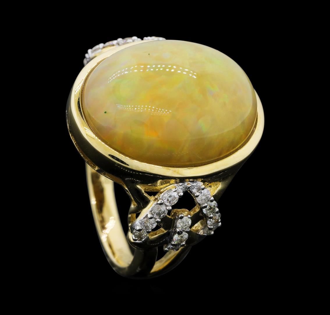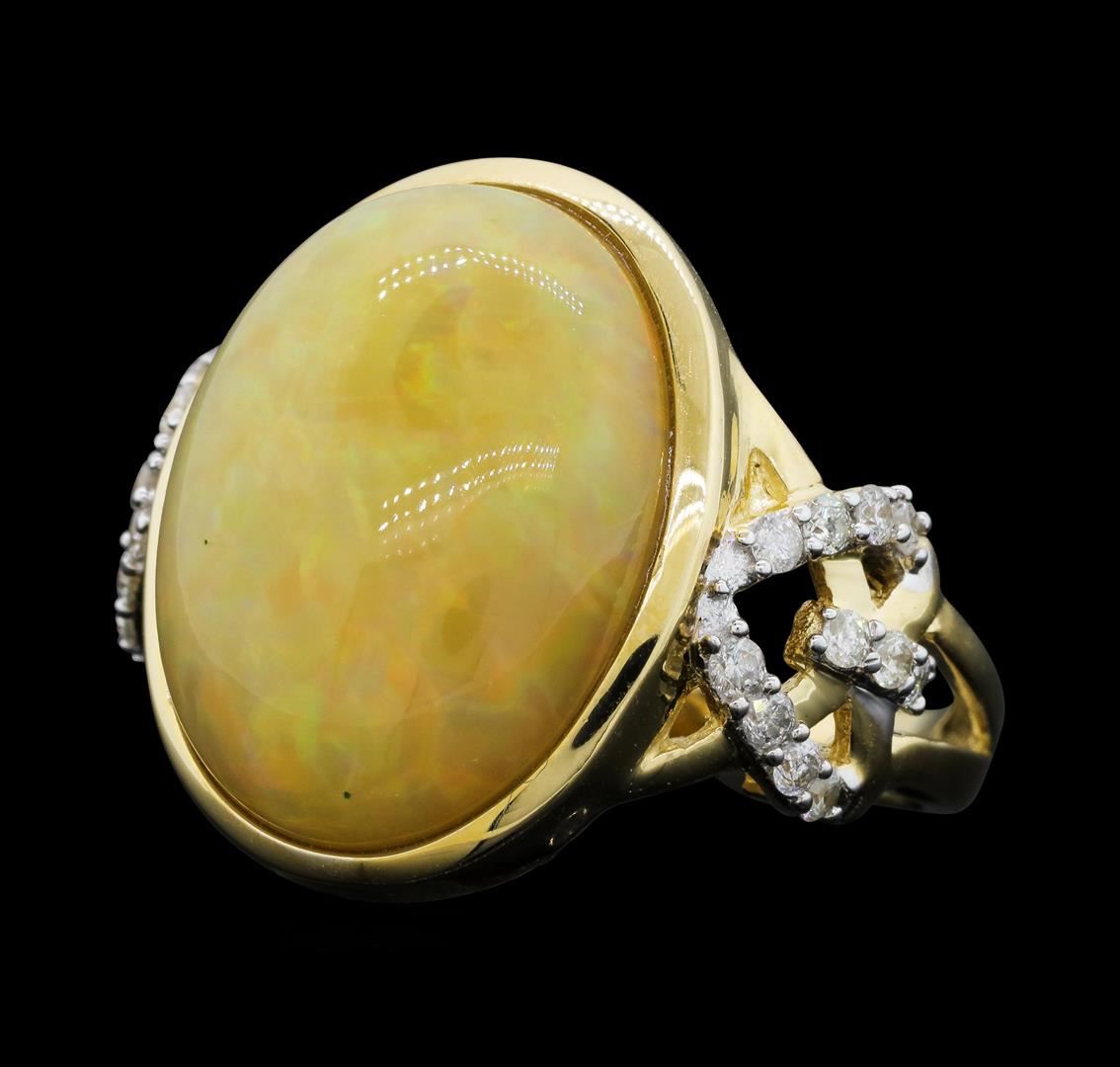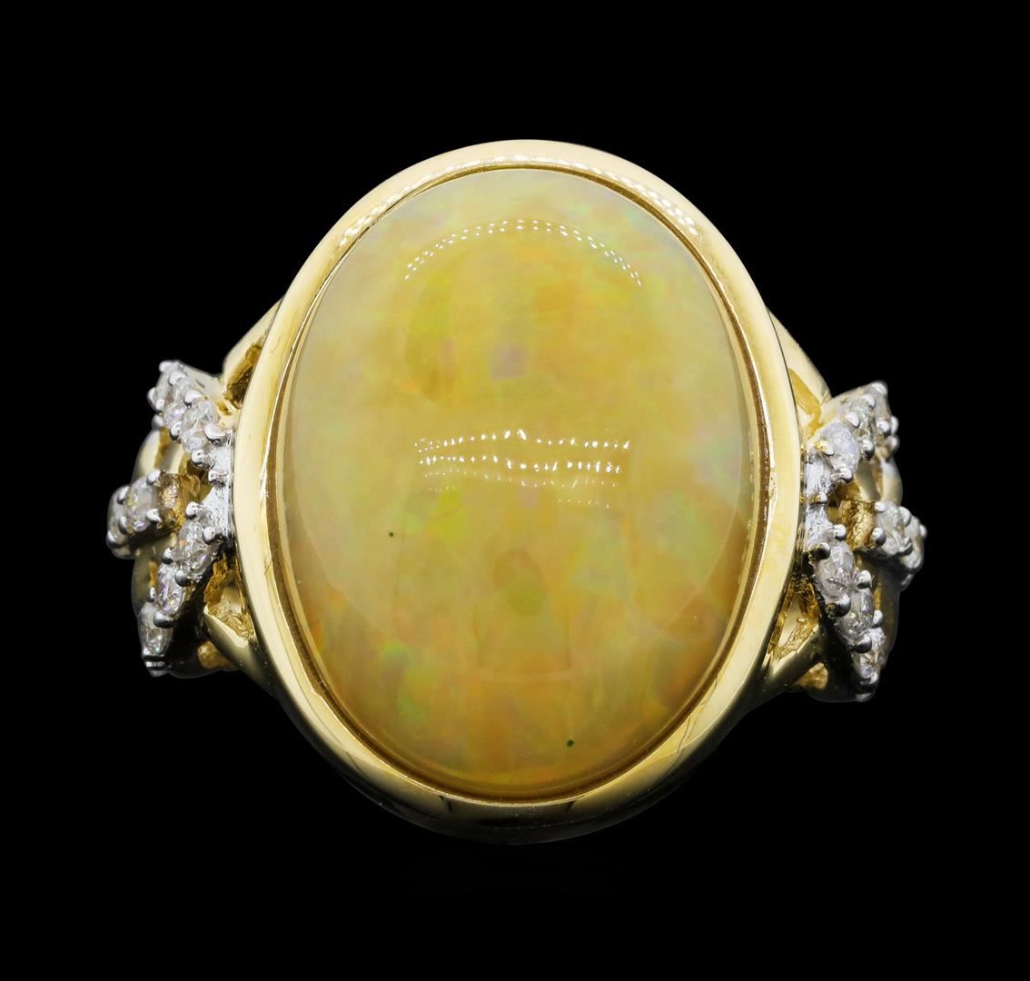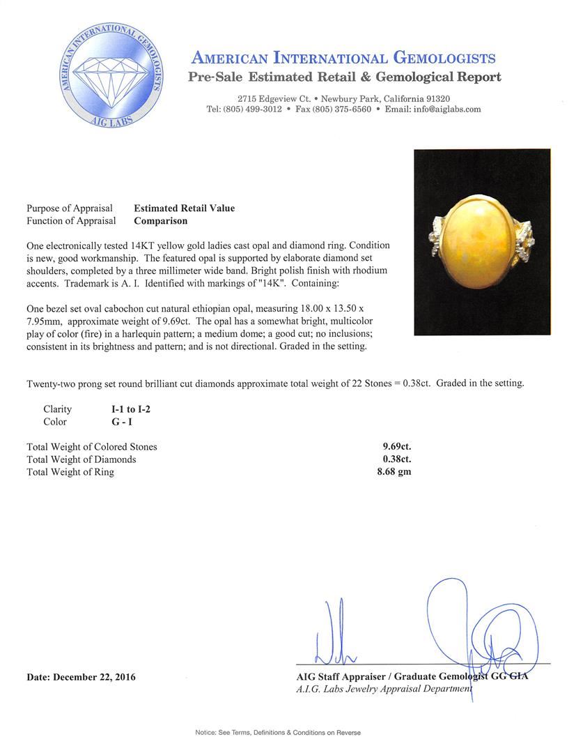 One electronically tested 14KT yellow gold ladies cast opal and diamond ring. The featured opal is supported by elaborate diamond set shoulders, completed by a three millimeter wide band. Bright polish finish with rhodium accents. Trademark is A. I. Identified with markings of "14K". Condition is new, good workmanship. Containing: One bezel set oval cabochon cut natural Ethiopian opal, measuring 18.00 x 13.50 x 7.95mm, approximate weight of 9.69ct. The opal has a somewhat bright, multicolor play of color (fire) in a harlequin pattern; a medium dome; a good cut; no inclusions; consistent in its brightness and pattern; and is not directional. Graded in the setting. Twenty-Two prong set round brilliant cut diamonds approximate total weight of 22 Stones = 0.38ct. Graded in the setting. Clarity: I-1 to I-2. Color: G - I. Total Weight of Colored Stones 9.69ct. Total Weight of Diamonds 0.38ct. Total Weight of Ring 8.68gm. AIG Appraised.