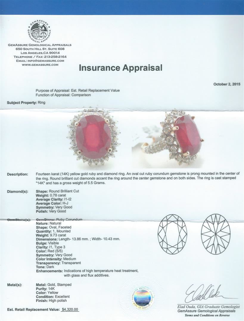 14KT yellow gold ruby and diamond ring. An oval cut ruby corundum gemstone weighing in at an aproximate 9.73 carats is prong mounted in the center of the ring. Approximately 0.78 carats of round brilliant cut diamonds accent the ring around the center gemstones and on both sides. The ring is cast stamped "14K" and has a gross weight of 5.5 grams. The diamonds have an average clarity of I1-I2. Ruby color is red, intensity is medium. Finish: High polish. Condition: Excellent GGA Appraised at $4,320.00.
