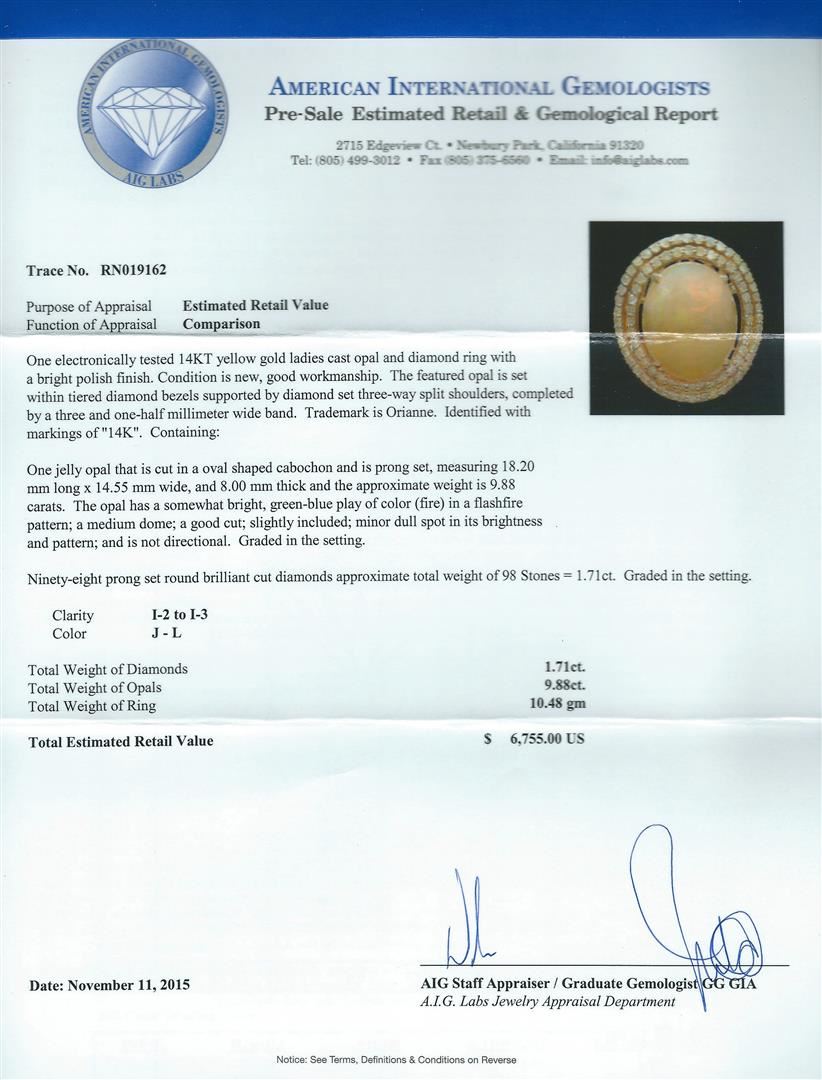 One electronically tested 14KT yellow gold ladies cast opal and diamond ring with a bright polish finish. The featured opal is set within tiered diamond bezels supported by diamond set three-way split shoulders, completed by a three and one-half millimeter wide band. Trademark is Orianne. Identified with markings of "14K". Condition is new, good workmanship. Containing: One jelly opal that is cut in a oval shaped cabochon and is prong set, measuring 18.20 mm long x 14.55 mm wide, and 8.00 mm thick and the approximate weight is 9.88 carats. The opal has a somewhat bright, green-blue play of color (fire) in a flashfire pattern; a medium dome; a good cut; slightly included; minor dull spot in its brightness and pattern; and is not directional. Graded in the setting. Ninety-Eight prong set round brilliant cut diamonds approximate. Total Weight of 98 Stones = 1.71ct. Graded in the setting. Clarity: I-2 to I-3. Color: J - L. Total Weight of Diamonds 1.71ct. Total Weight of Opals 9.88ct. Total Weight of Ring 10.48gm. AIG Appraised at $6,755.00.