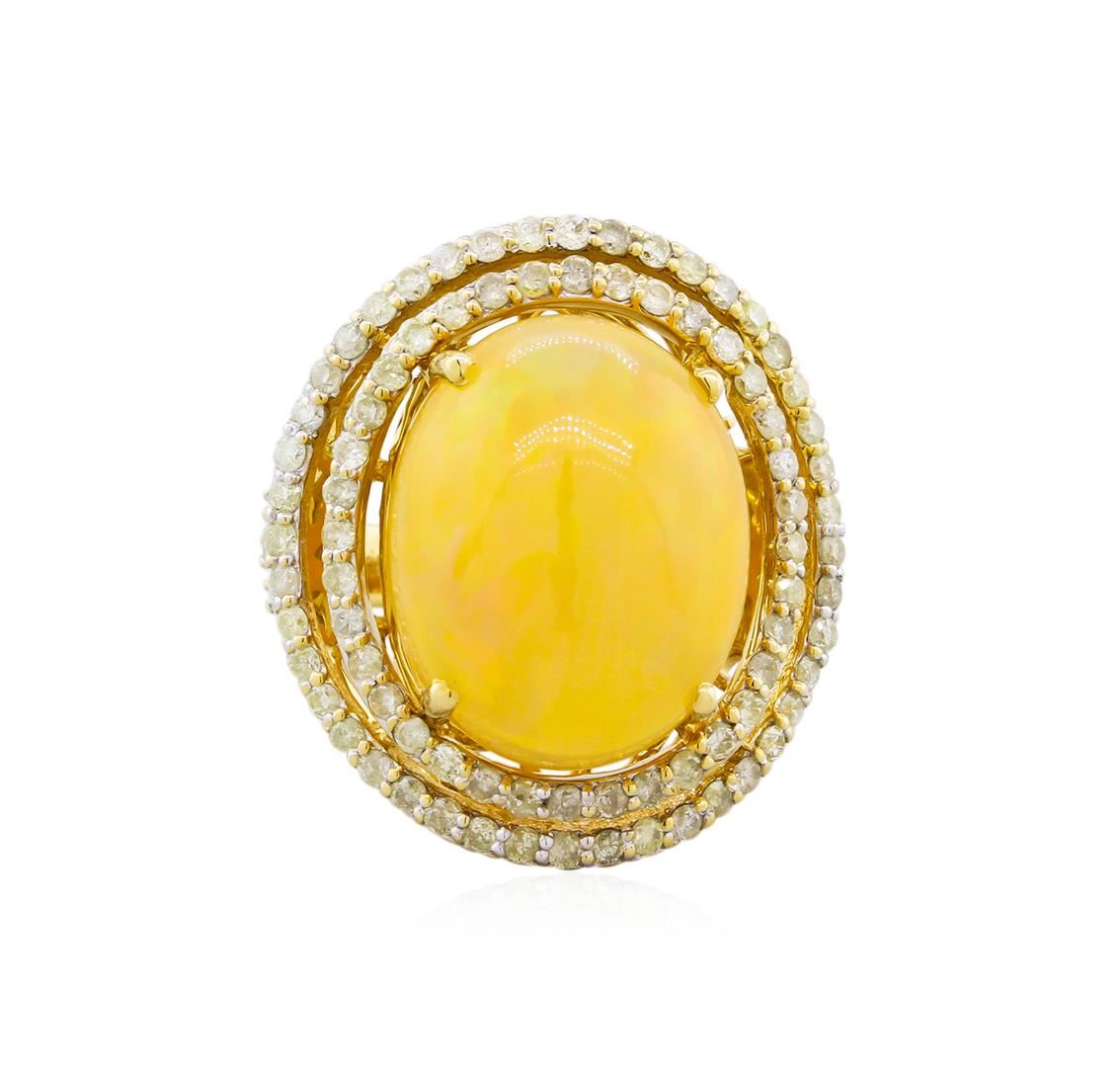 One electronically tested 14KT yellow gold ladies cast opal and diamond ring with a bright polish finish. The featured opal is set within tiered diamond bezels supported by diamond set three-way split shoulders, completed by a three and one-half millimeter wide band. Trademark is Orianne. Identified with markings of "14K". Condition is new, good workmanship. Containing: One jelly opal that is cut in a oval shaped cabochon and is prong set, measuring 18.20 mm long x 14.55 mm wide, and 8.00 mm thick and the approximate weight is 9.88 carats. The opal has a somewhat bright, green-blue play of color (fire) in a flashfire pattern; a medium dome; a good cut; slightly included; minor dull spot in its brightness and pattern; and is not directional. Graded in the setting. Ninety-Eight prong set round brilliant cut diamonds approximate. Total Weight of 98 Stones = 1.71ct. Graded in the setting. Clarity: I-2 to I-3. Color: J - L. Total Weight of Diamonds 1.71ct. Total Weight of Opals 9.88ct. Total Weight of Ring 10.48gm. AIG Appraised at $6,755.00.