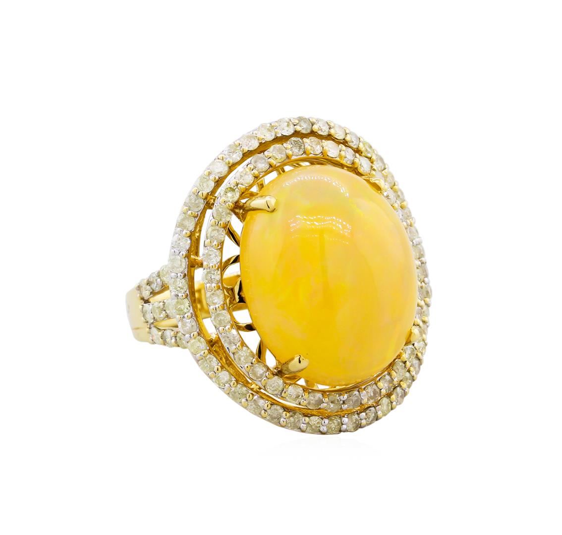 One electronically tested 14KT yellow gold ladies cast opal and diamond ring with a bright polish finish. The featured opal is set within tiered diamond bezels supported by diamond set three-way split shoulders, completed by a three and one-half millimeter wide band. Trademark is Orianne. Identified with markings of "14K". Condition is new, good workmanship. Containing: One jelly opal that is cut in a oval shaped cabochon and is prong set, measuring 18.20 mm long x 14.55 mm wide, and 8.00 mm thick and the approximate weight is 9.88 carats. The opal has a somewhat bright, green-blue play of color (fire) in a flashfire pattern; a medium dome; a good cut; slightly included; minor dull spot in its brightness and pattern; and is not directional. Graded in the setting. Ninety-Eight prong set round brilliant cut diamonds approximate. Total Weight of 98 Stones = 1.71ct. Graded in the setting. Clarity: I-2 to I-3. Color: J - L. Total Weight of Diamonds 1.71ct. Total Weight of Opals 9.88ct. Total Weight of Ring 10.48gm. AIG Appraised at $6,755.00.