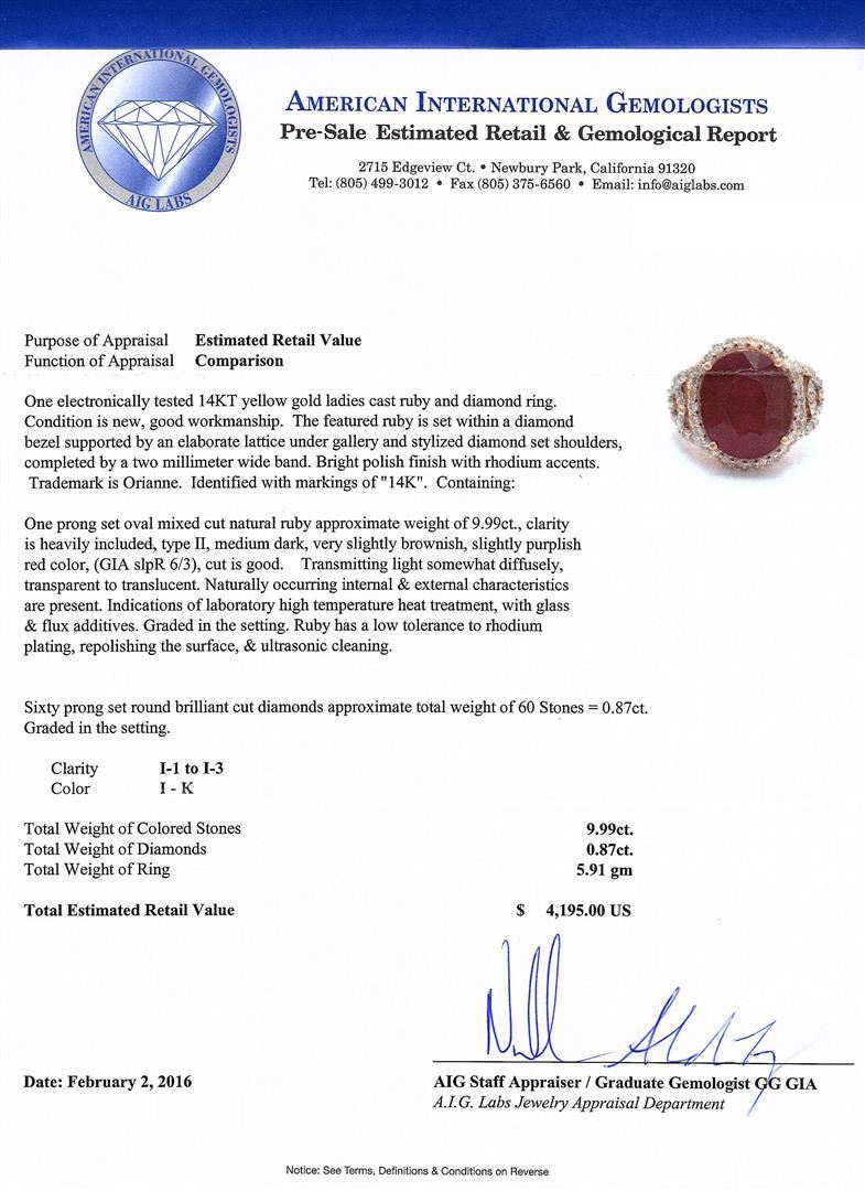 One electronically tested 14KT yellow gold ladies cast ruby and diamond ring. The featured ruby is set within a diamond bezel supported by an elaborate lattice under gallery and stylized diamond set shoulders, completed by a two millimeter wide band. Bright polish finish with rhodium accents. Trademark is Orianne. Identified with markings of "14K". Condition is new, good workmanship. Containing: One prong set oval mixed cut natural ruby approximate weight of 9.99ct., clarity is heavily included, type II, medium dark, very slightly brownish, slightly purplish red color, (GIA slpR 6/3), cut is good. Transmitting light somewhat diffusely, transparent to translucent. Naturally occurring internal & external characteristics are present. Indications of laboratory high temperature heat treatment, with glass & flux additives. Graded in the setting. Ruby has a low tolerance to rhodium plating, repolishing the surface, & ultrasonic cleaning.Sixty prong set round brilliant cut diamonds approximate. Total Weight of 60 Stones = 0.87ct. Graded in the setting. Clarity: I-1 to I-3. Color: I - K. Total Weight of Colored Stones 9.99ct. Total Weight of Diamonds 0.87ct. Total Weight of Ring 5.91gm. AIG Appraised at $4,195.00.