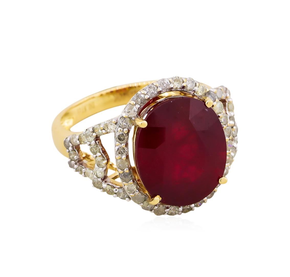 One electronically tested 14KT yellow gold ladies cast ruby and diamond ring. The featured ruby is set within a diamond bezel supported by an elaborate lattice under gallery and stylized diamond set shoulders, completed by a two millimeter wide band. Bright polish finish with rhodium accents. Trademark is Orianne. Identified with markings of "14K". Condition is new, good workmanship. Containing: One prong set oval mixed cut natural ruby approximate weight of 9.99ct., clarity is heavily included, type II, medium dark, very slightly brownish, slightly purplish red color, (GIA slpR 6/3), cut is good. Transmitting light somewhat diffusely, transparent to translucent. Naturally occurring internal & external characteristics are present. Indications of laboratory high temperature heat treatment, with glass & flux additives. Graded in the setting. Ruby has a low tolerance to rhodium plating, repolishing the surface, & ultrasonic cleaning.Sixty prong set round brilliant cut diamonds approximate. Total Weight of 60 Stones = 0.87ct. Graded in the setting. Clarity: I-1 to I-3. Color: I - K. Total Weight of Colored Stones 9.99ct. Total Weight of Diamonds 0.87ct. Total Weight of Ring 5.91gm. AIG Appraised at $4,195.00.