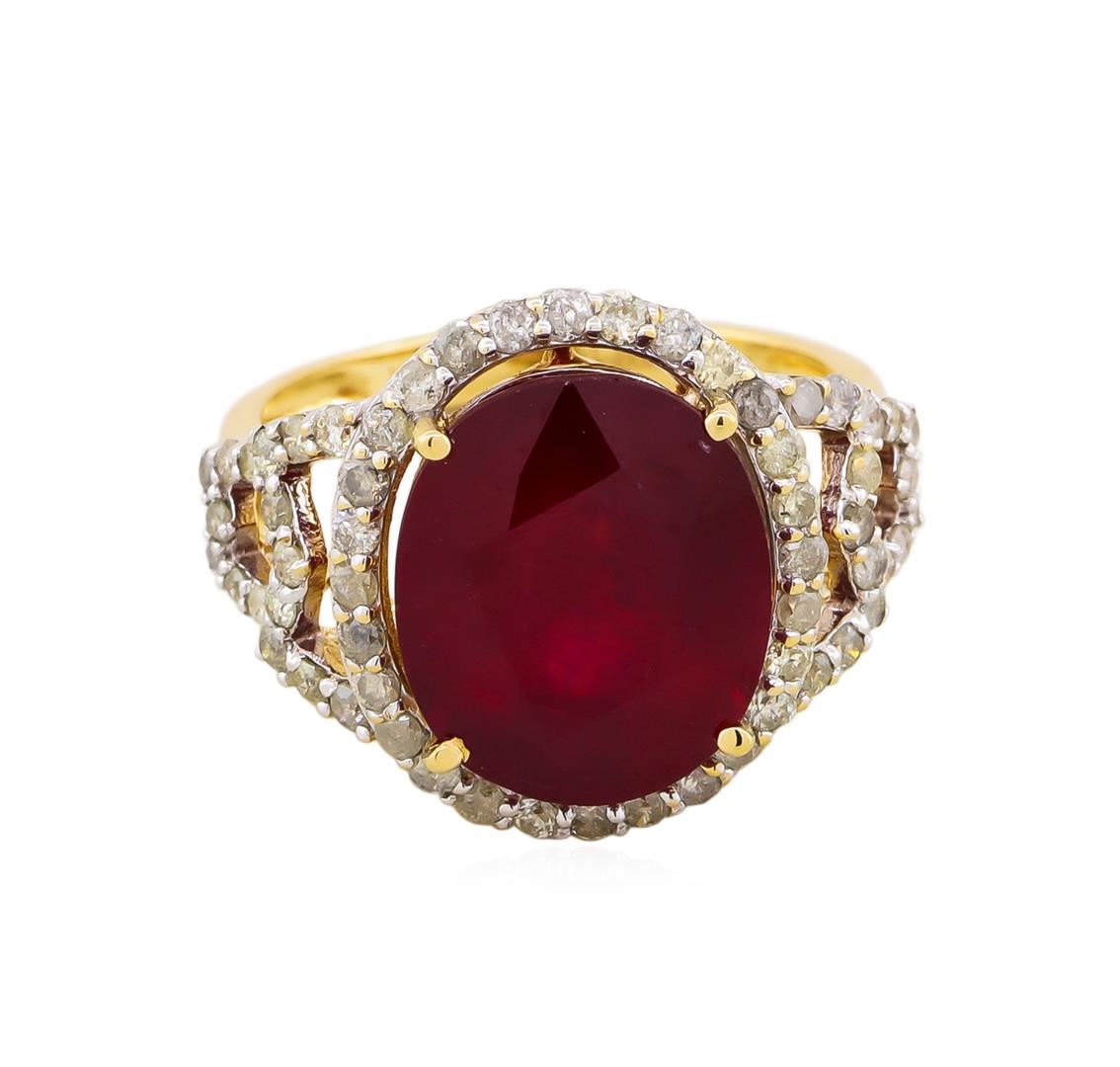 One electronically tested 14KT yellow gold ladies cast ruby and diamond ring. The featured ruby is set within a diamond bezel supported by an elaborate lattice under gallery and stylized diamond set shoulders, completed by a two millimeter wide band. Bright polish finish with rhodium accents. Trademark is Orianne. Identified with markings of "14K". Condition is new, good workmanship. Containing: One prong set oval mixed cut natural ruby approximate weight of 9.99ct., clarity is heavily included, type II, medium dark, very slightly brownish, slightly purplish red color, (GIA slpR 6/3), cut is good. Transmitting light somewhat diffusely, transparent to translucent. Naturally occurring internal & external characteristics are present. Indications of laboratory high temperature heat treatment, with glass & flux additives. Graded in the setting. Ruby has a low tolerance to rhodium plating, repolishing the surface, & ultrasonic cleaning.Sixty prong set round brilliant cut diamonds approximate. Total Weight of 60 Stones = 0.87ct. Graded in the setting. Clarity: I-1 to I-3. Color: I - K. Total Weight of Colored Stones 9.99ct. Total Weight of Diamonds 0.87ct. Total Weight of Ring 5.91gm. AIG Appraised at $4,195.00.