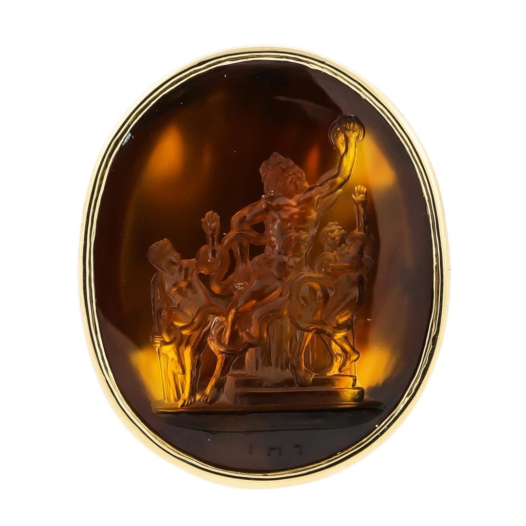 One 14KT Yellow Gold Amber Pendant with a total weight of 9.6 grams.