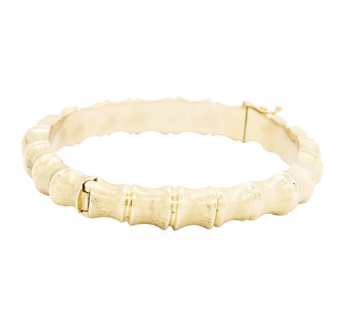 One lady's bamboo motif bangle bracelet featuring: 14KT yellow gold weighing 27.6 grams. The bracelet measures approximately seven inches in circumference.