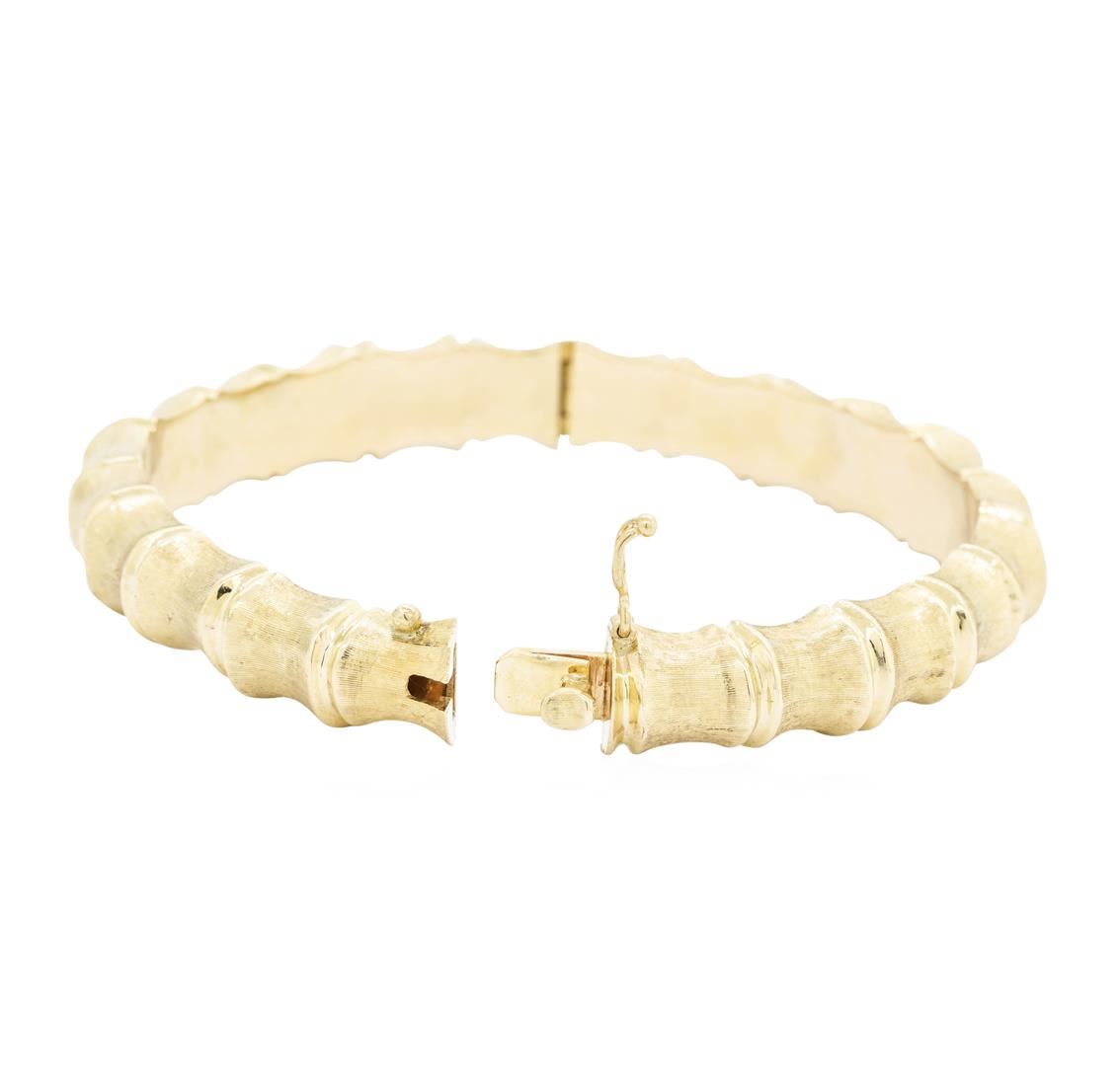 One lady's bamboo motif bangle bracelet featuring: 14KT yellow gold weighing 27.6 grams. The bracelet measures approximately seven inches in circumference.