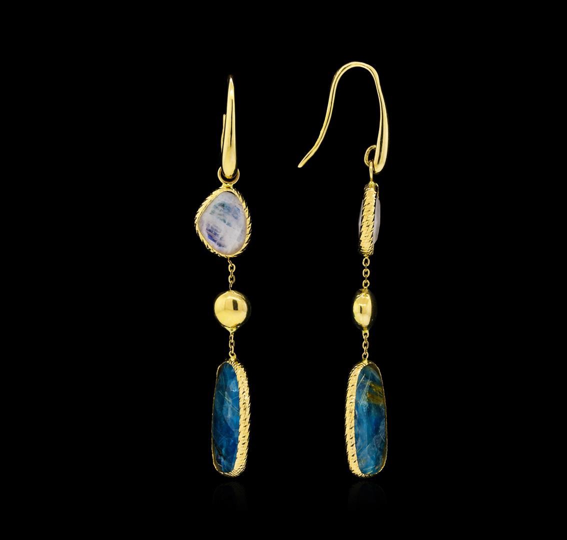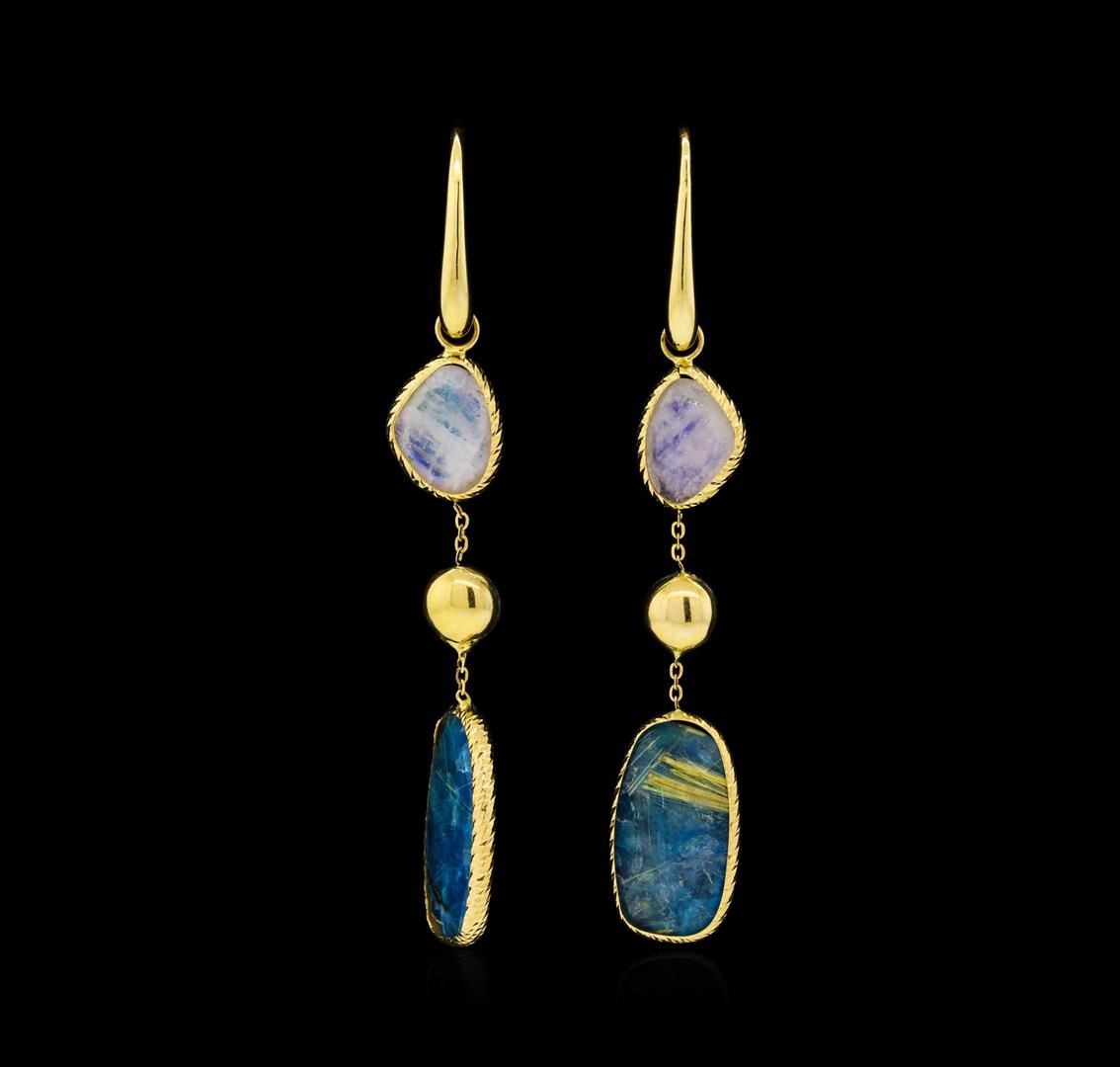 One pair of Ladies dangle earrings featuring: 14KT yellow gold weighing 5.9 grams containing two blue and two white gemstones. The earrings have a drop of 62 millimeters.