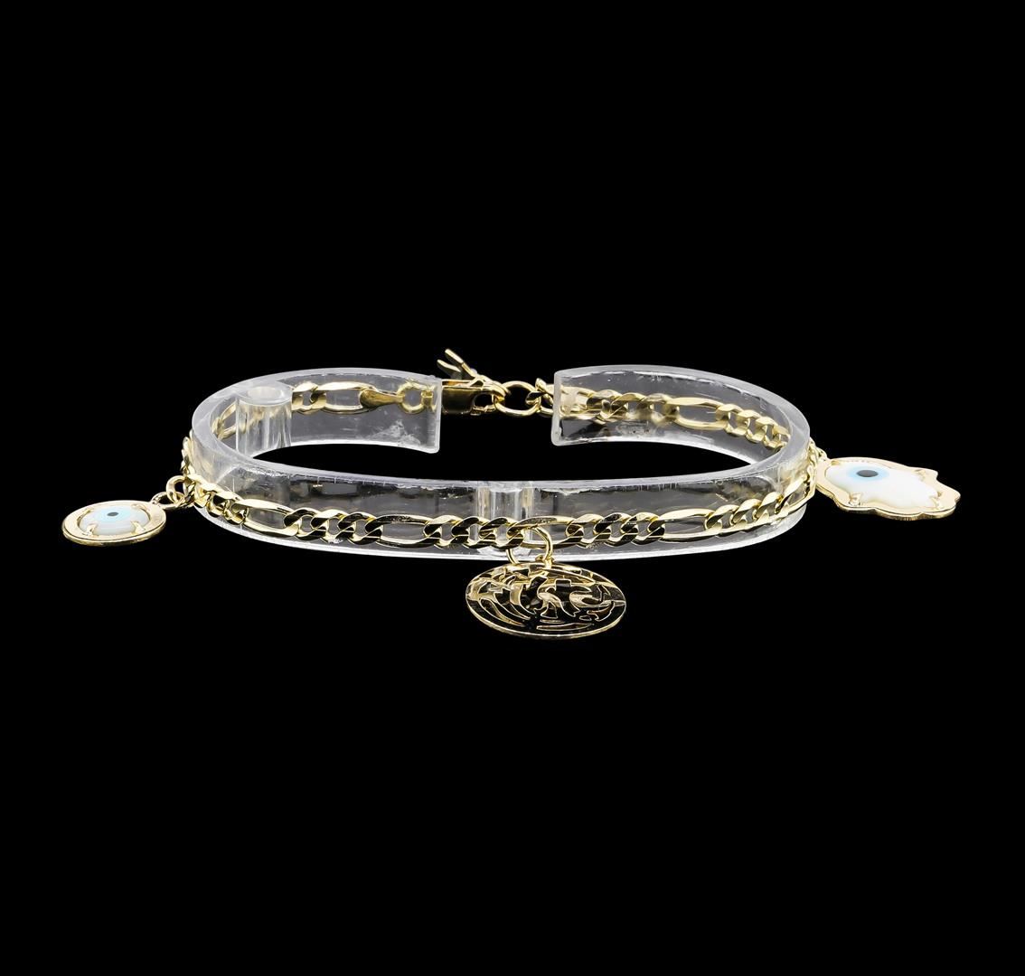 One Ladies charm bracelet measuring 7.5 inches long featuring: 14KT yellow gold weighing 9.5 grams containing two evil eye charms, a cross charm and a round charm.