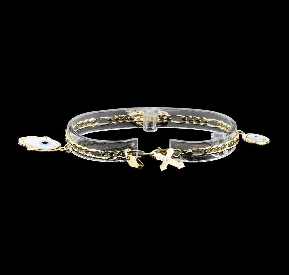 One Ladies charm bracelet measuring 7.5 inches long featuring: 14KT yellow gold weighing 9.5 grams containing two evil eye charms, a cross charm and a round charm.