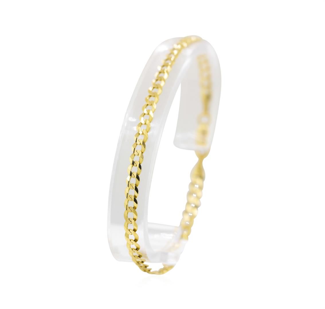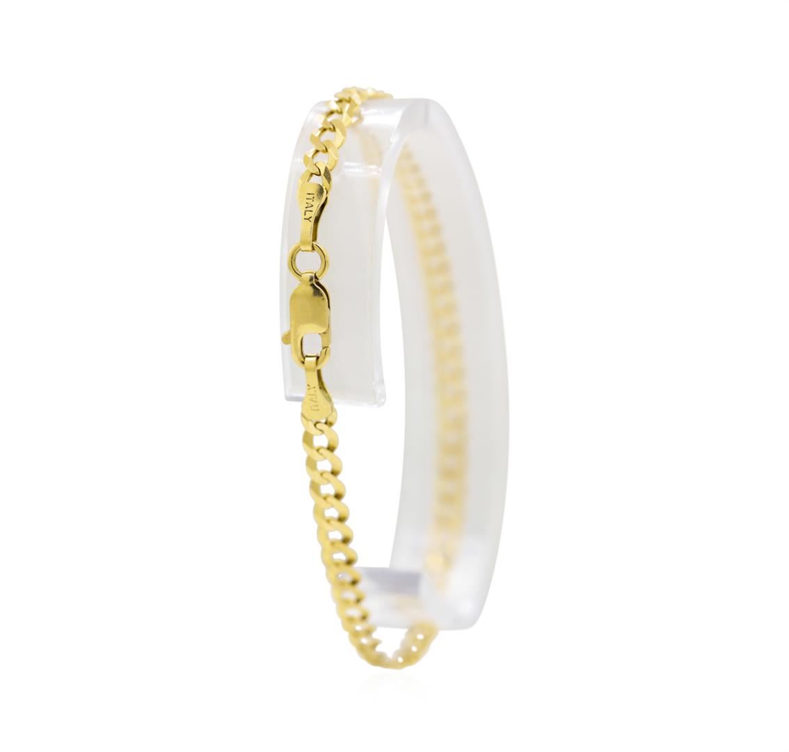 One curb link bracelet featuring: 14KT yellow gold weighing 3.2 grams. The bracelet measures approximately seven inches in length.