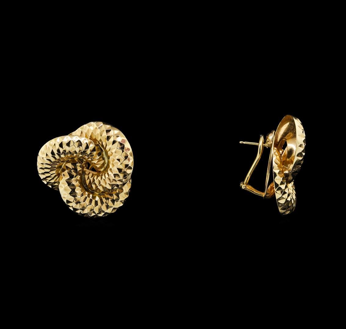 One pair of 14KT Yellow Gold Diamond Cut Inter Locking Circle Earrings with a total weight of 13.67 grams.